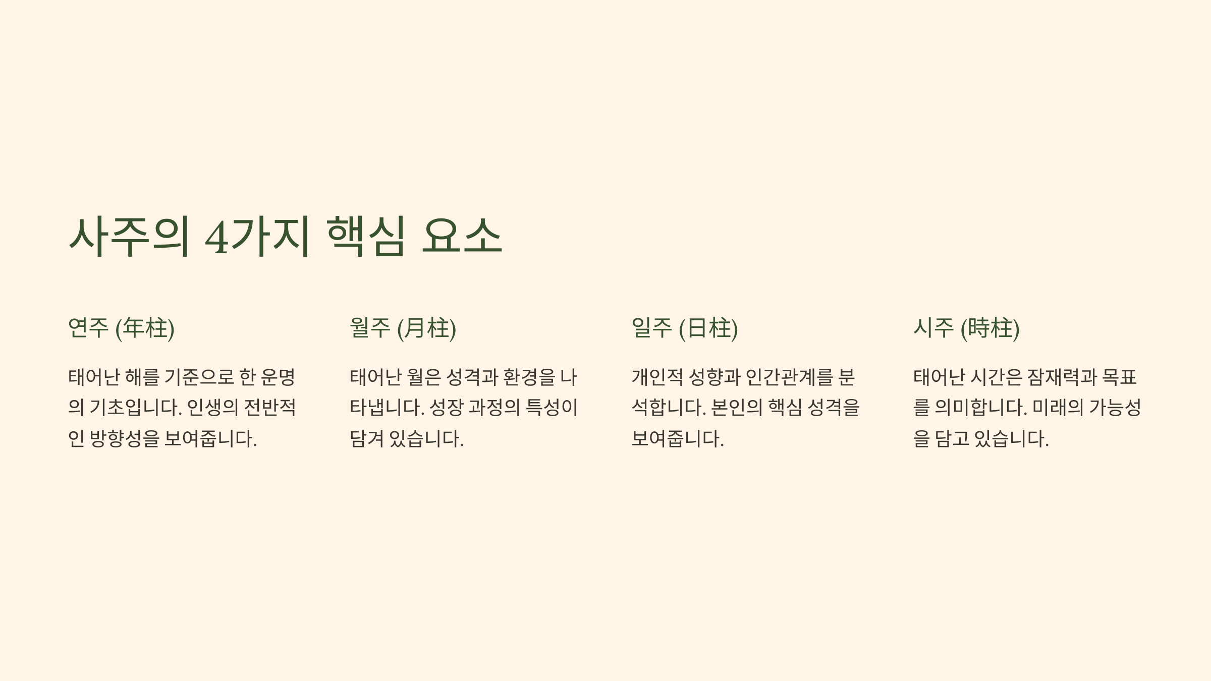 이렇게 사주는 단순히 태어난 시간만 보는 게 아니라, 자연의 흐름과 조화를 기반으로 인생의 에너지 흐름을 파악하는 구조예요. 다음은 각 기둥의 의미를 하나씩 살펴볼게요!