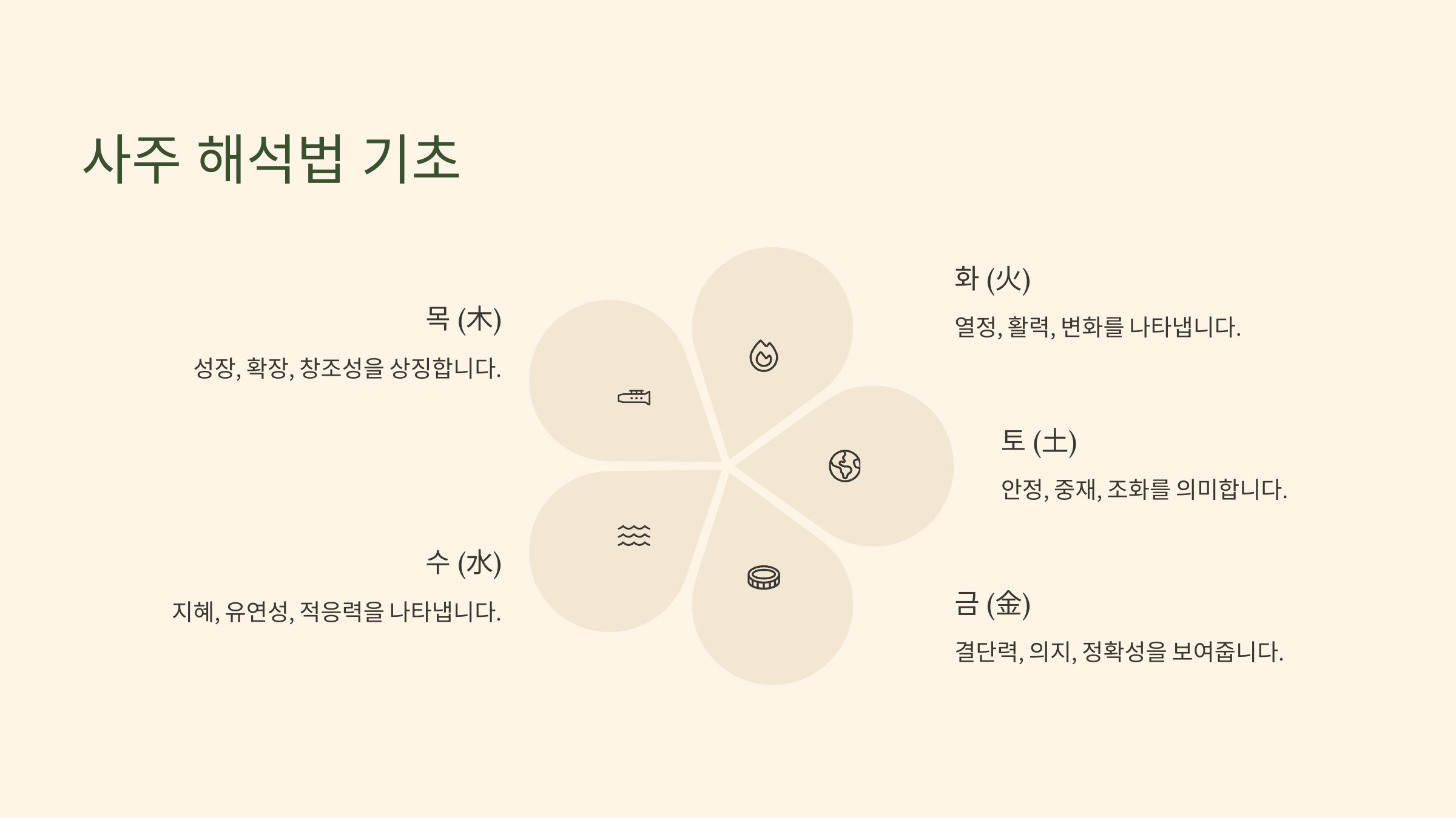 항상 일간부터 해석하세요! 사주풀이의 중심축은 일간이에요. 주변 요소인 연주, 월주, 시주는 일간에 어떤 영향을 미치는지를 보는 거라서, 일간이 어떤 오행인지, 성향이 어떤지를 먼저 파악하는 게 핵심이에요.📌 TIP 2. 오행 불균형에 너무 집착하지 않기