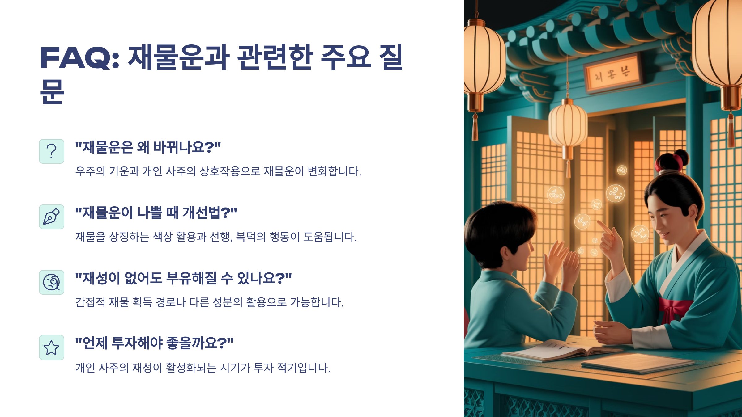 A6. 생년월일시로 대운·세운을 계산해보면 재성 흐름을 확인할 수 있어요. 전문가 상담이 도움돼요.