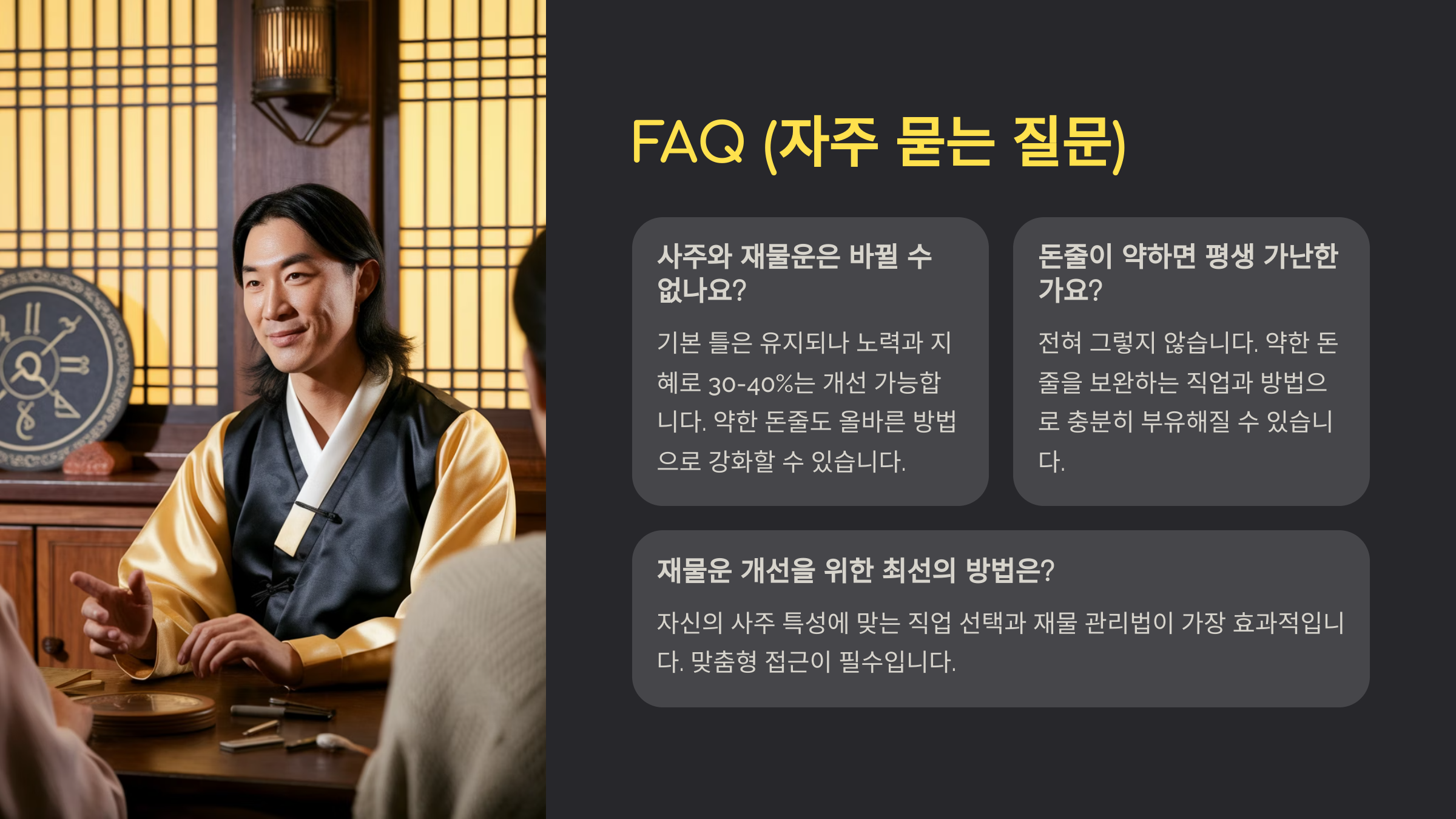 A5. 환경, 행동, 인맥, 습관을 바꾸는 게 시작이에요. 사주는 가능성을 보여주는 도구이고, 현실은 실천이 바꿔요. 적절한 타이밍을 활용해요.