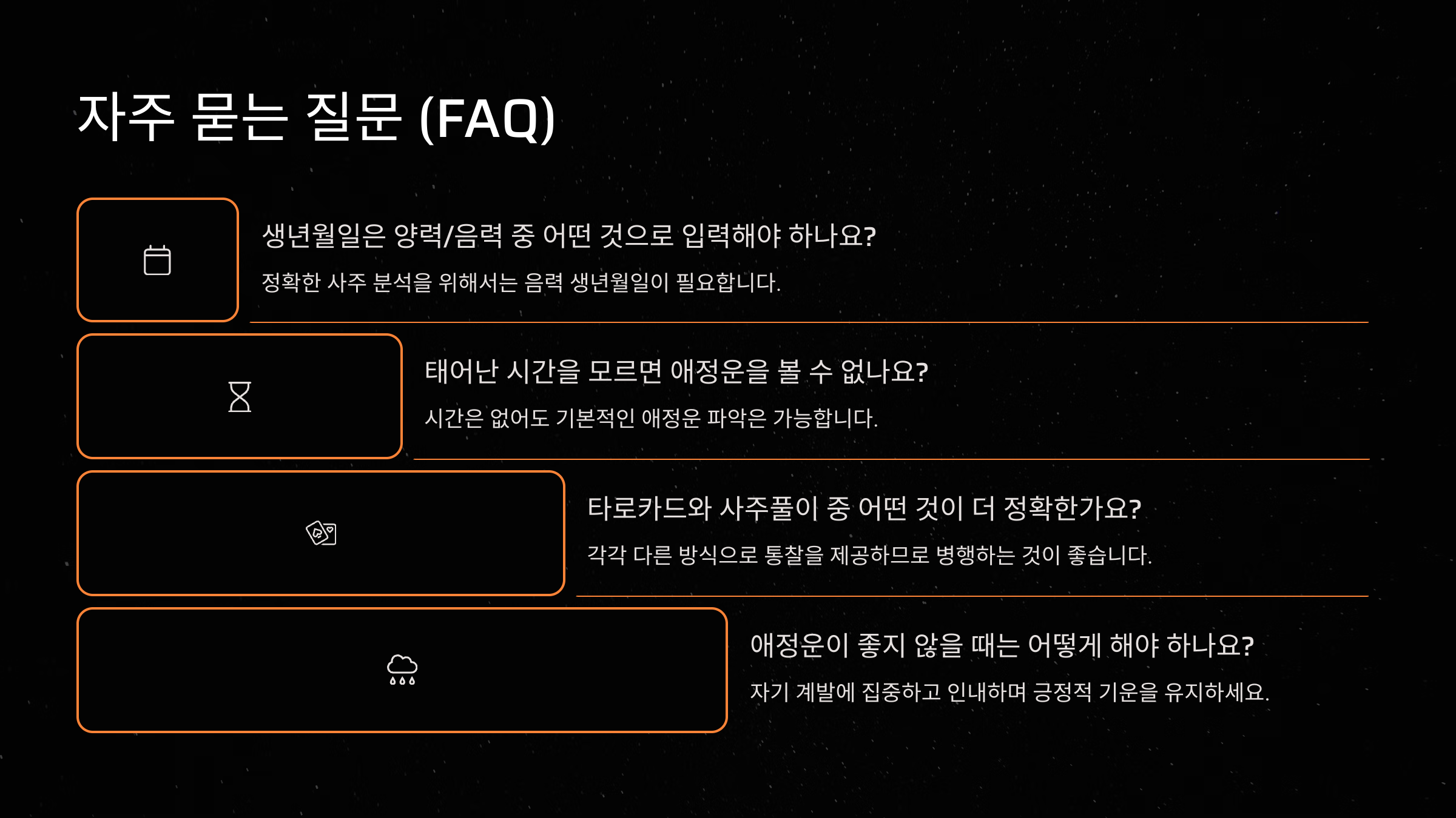 Q1. 애정운은 실제로 연애에 영향을 주나요?A1. 네, 많은 사람이 애정운이 좋을 때 감정이 개방적이 되고 자신감도 올라가 연애에 긍정적인 영향을 받는다고 해요.