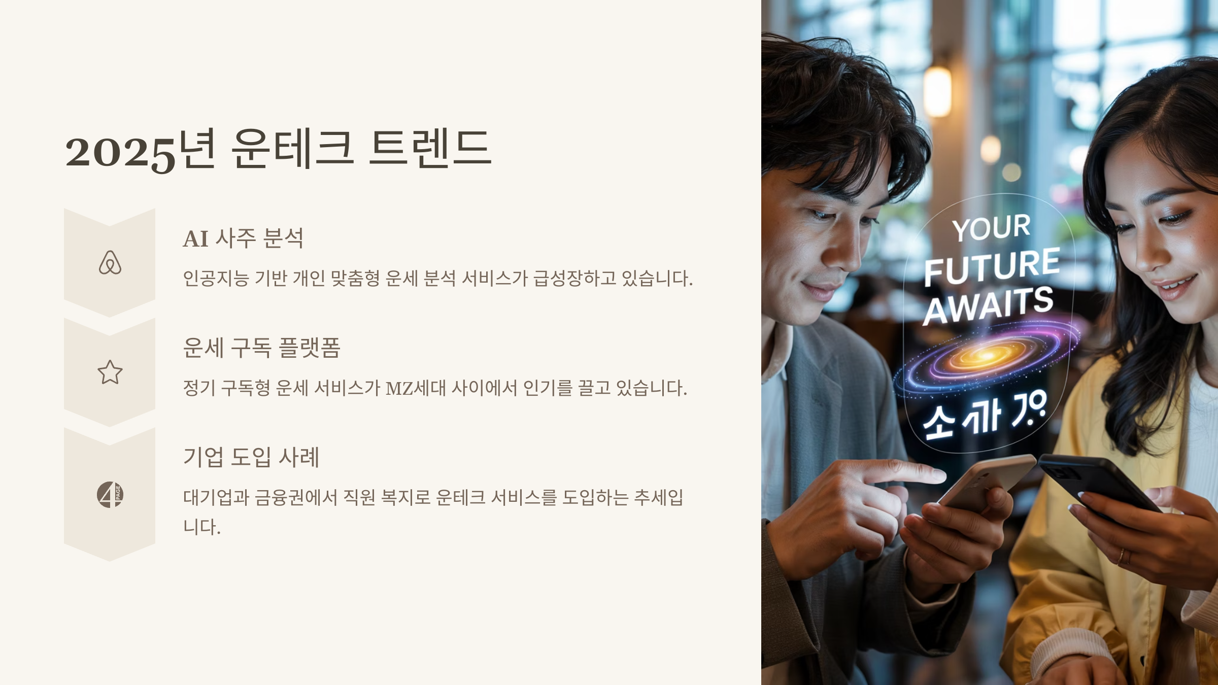 2025년은 '운을 읽는 능력'이 하나의 핵심 경쟁력으로 떠오르는 해예요. 단순히 재테크를 넘어서 '운테크'가 주류로 자리 잡고 있는 만큼, 올해는 이전과는 또 다른 트렌드가 눈에 띄게 나타나고 있어요. 특히 디지털 기반의 운세 서비스가 급부상하면서 사주가 한층 더 현대화되고 있어요.