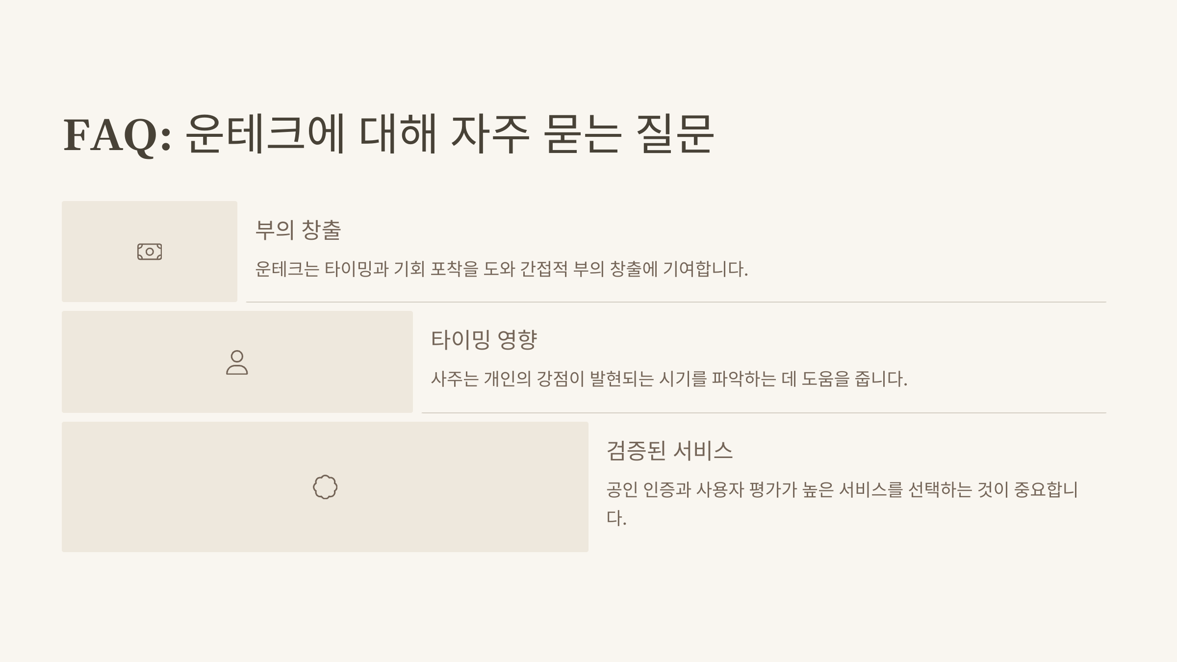 A1. 운테크는 사주 데이터를 바탕으로 인생의 흐름을 예측하고 준비하는 전략이기 때문에, 실제로 행동에 옮길 수 있다면 분명한 도움이 돼요. 타이밍과 흐름을 알면 시행착오를 줄일 수 있답니다.