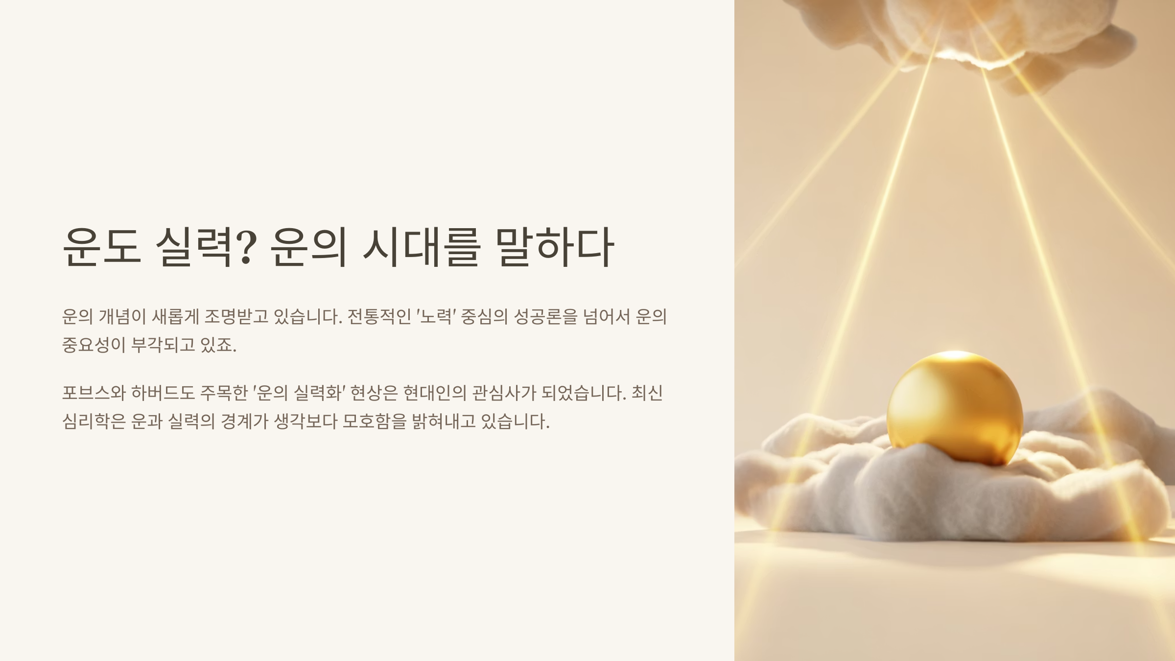 ‘운도 실력이다’는 말은 더 이상 멋진 말이 아니라 현실이 되었어요. 지금은 노력과 실력 위에 운이라는 감각이 덧붙여져야 진짜 '성공 플랜'이 되는 시대라고 할 수 있어요. 운을 아예 배제하면 오히려 리스크가 될 수도 있다는 말이죠.