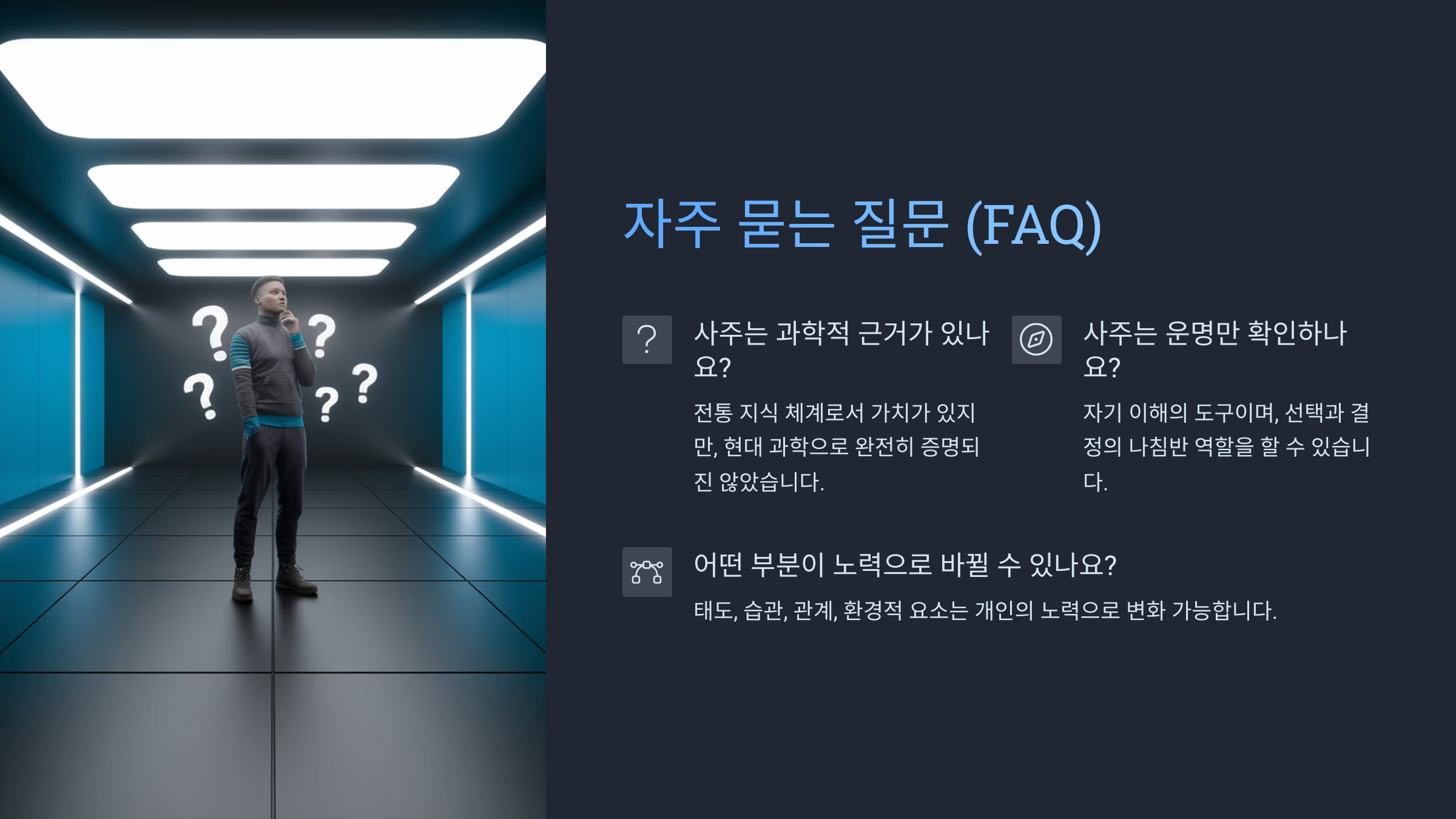 A6. 아니에요. 사주는 참고자료일 뿐 절대적인 운명의 지도가 아니에요. 나를 이해하는 도구로만 활용하는 게 좋아요.