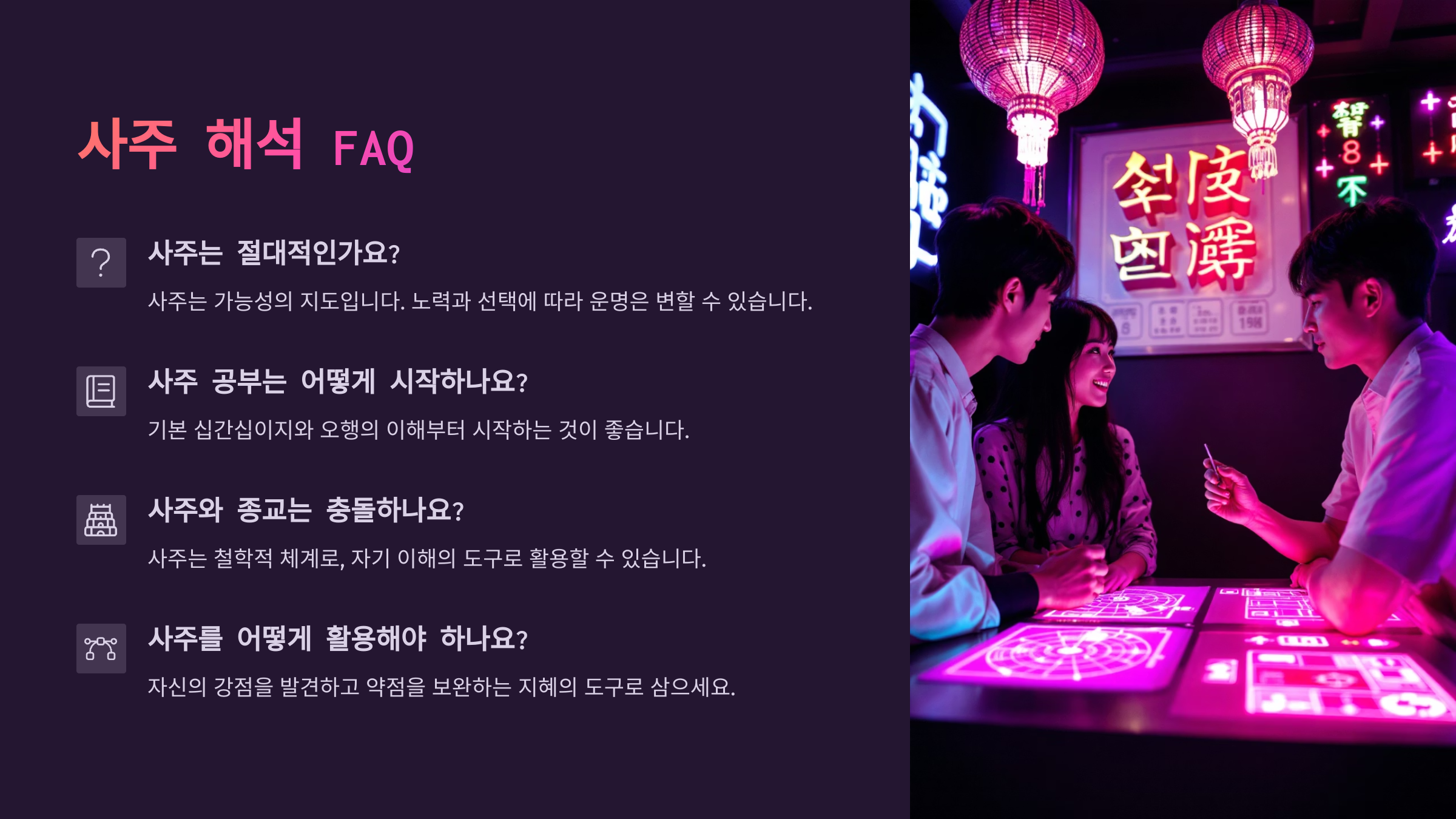 A7. 사주는 흐름일 뿐, 절대적인 운명은 아니에요. 오히려 약한 부분을 알면 예방하고 보완할 수 있어서 인생을 더 잘 이끌 수 있어요.