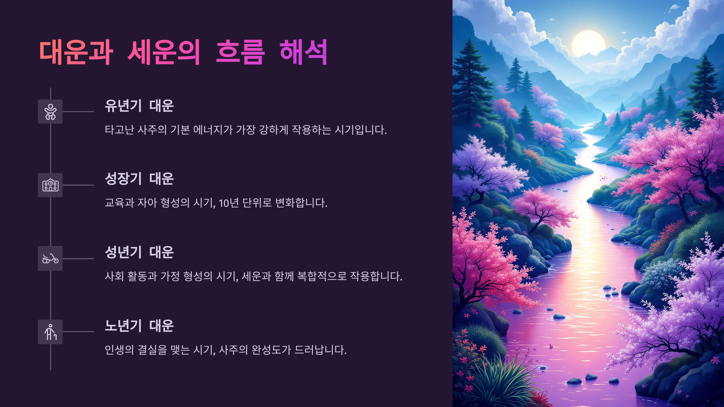대운은 10년 단위로 흐르는 큰 인생 주기예요. 이는 태어난 시점에서 4세에서 8세 사이에 시작되어 평생을 따라가요. 각 대운마다 들어오는 오행의 기운이 달라지기 때문에, 그 시기마다 성향과 운세가 바뀔 수 있어요. 예를 들어, 화(火)의 기운이 들어오는 대운이면 활동력이나 열정이 증가하죠.