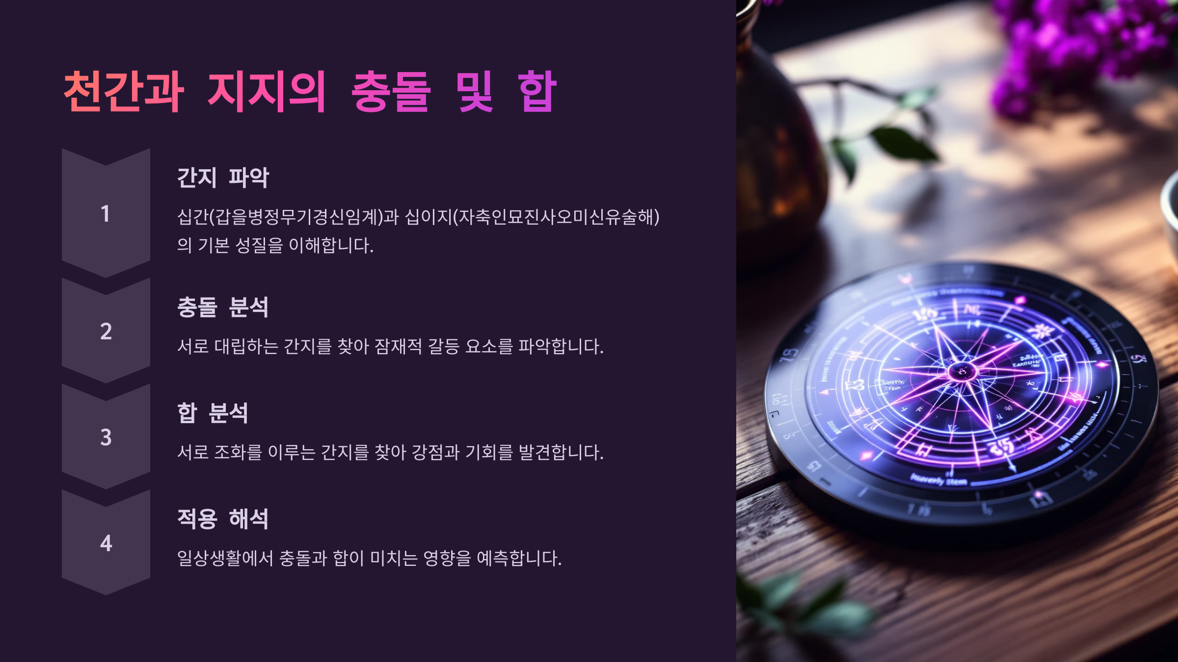 👉 다음은 사주의 기둥을 이루는 천간과 지지가 어떻게 충돌하거나 합을 이루는지 알아볼게요!⚡