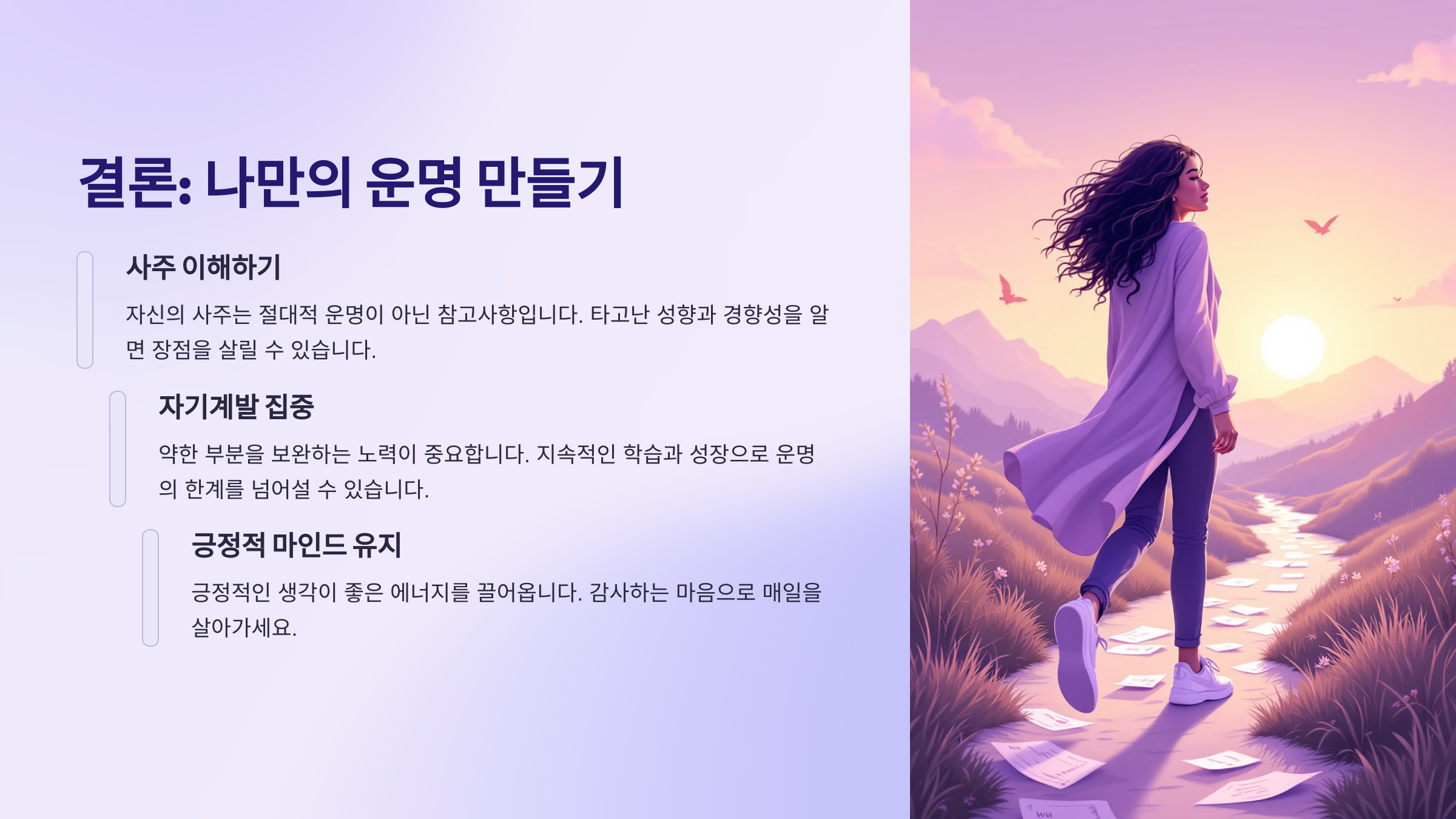 하지만 걱정하지 마세요. 사주는 고정된 운명이 아니라, 흐름을 알고 대처하면 충분히 개선할 수 있는 '지도' 같은 거랍니다. 내가 생각했을 때 사주는 내가 어디서 길을 잃을 수 있는지를 알려주는 내비게이션 같아요. 방향을 알면 돌파구도 찾을 수 있어요!