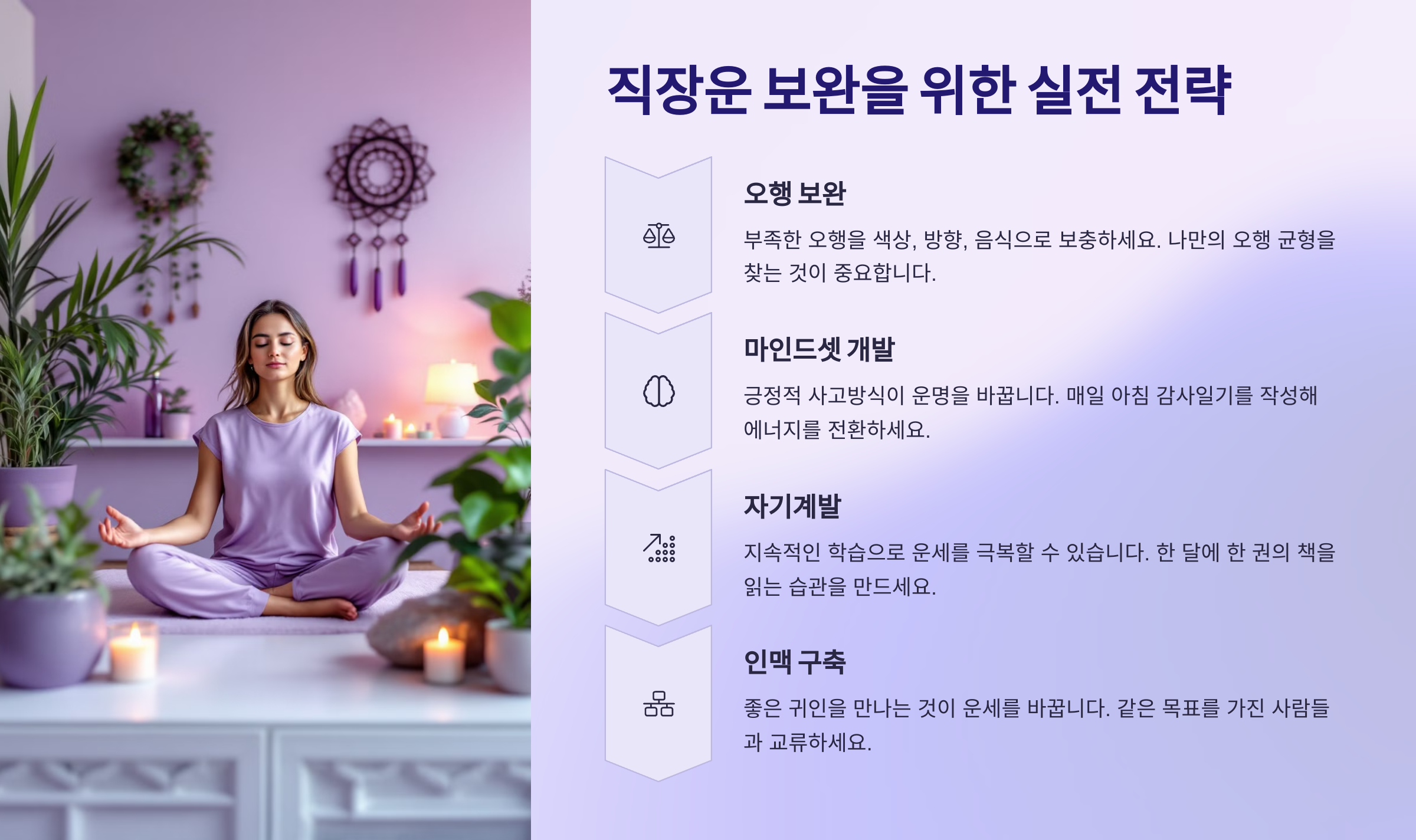 이제 이런 흐름을 바탕으로, 실제로 직장운이 부족한 사주를 가진 사람이 어떻게 인생을 개선할 수 있는지 구체적인 방법을 소개할게요! 🎯