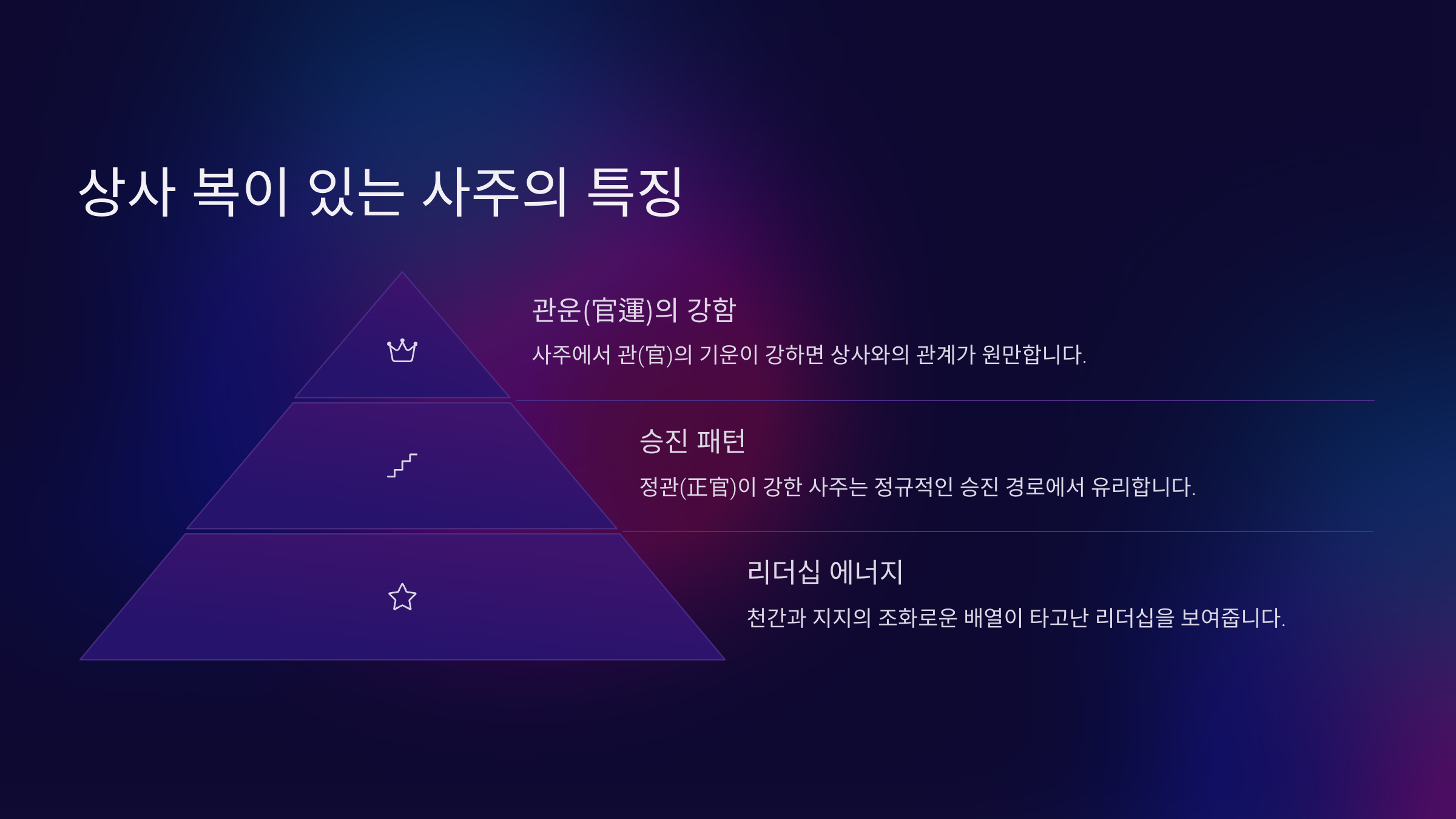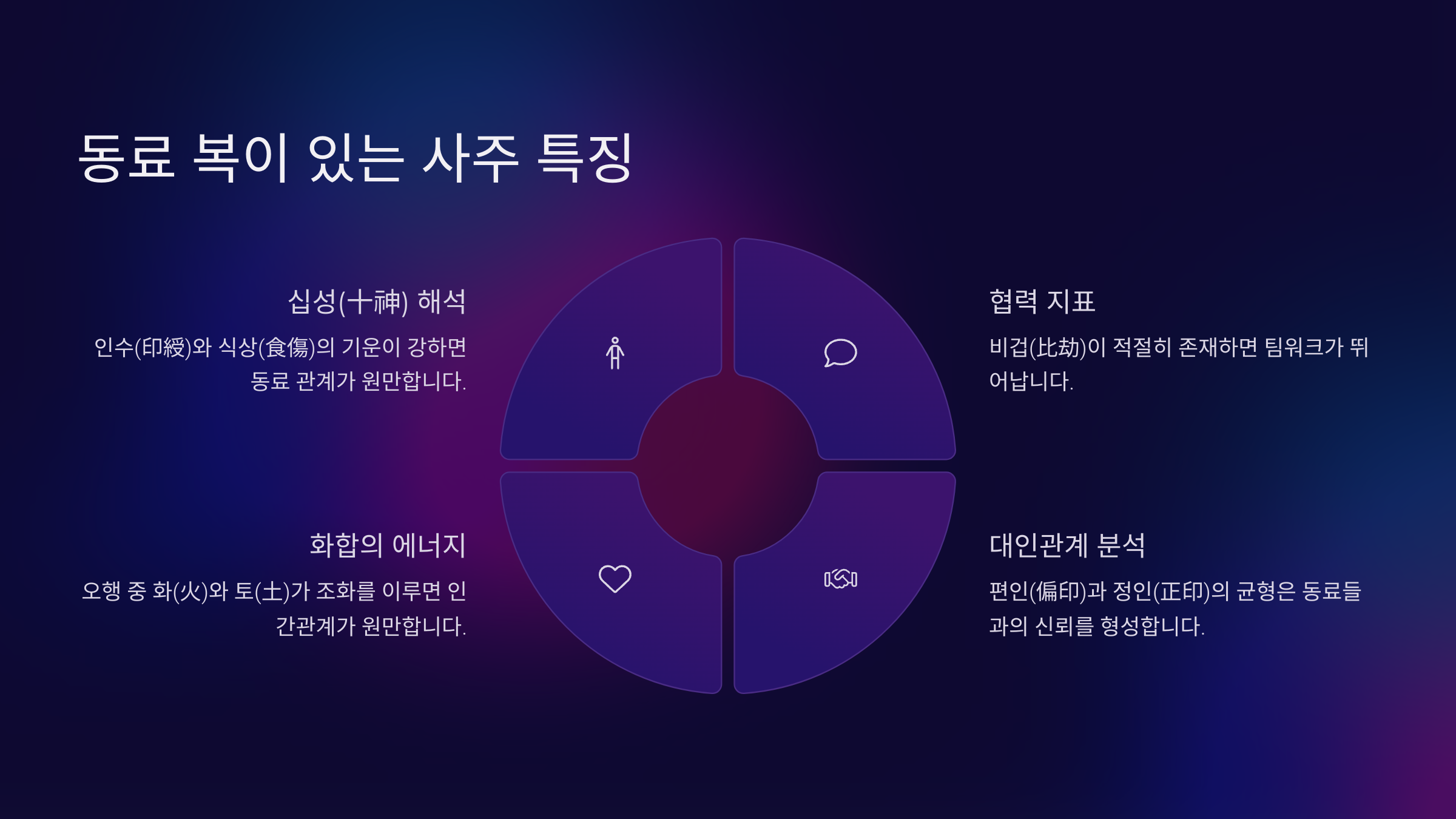 요소 상사 복 동료 복 사주 요소 관성, 인성 비견, 겁재 적합 환경 공기업, 대기업, 수직조직 스타트업, 크리에이티브 팀 효과 승진, 인사평가 우수 협업 시너지, 감정 안정 위험요소 권위 과잉, 감정적 거리 경쟁 과열, 팀 내 갈등 예를 들어, 사주에 관성이 튼튼하면서도 인성이 함께 받쳐주는 사람은 상사와의 관계가 매끄러워요. 이런 사람은 체계적인 조직에서 빠르게 성장할 수 있는 구조를 가지고 있죠. 반대로 비견과 겁재가 많고, 관성이 약한 사람은 스타트업이나 창의적인 분야에서 팀원들과 어울려 능력을 펼치는 데 강해요.