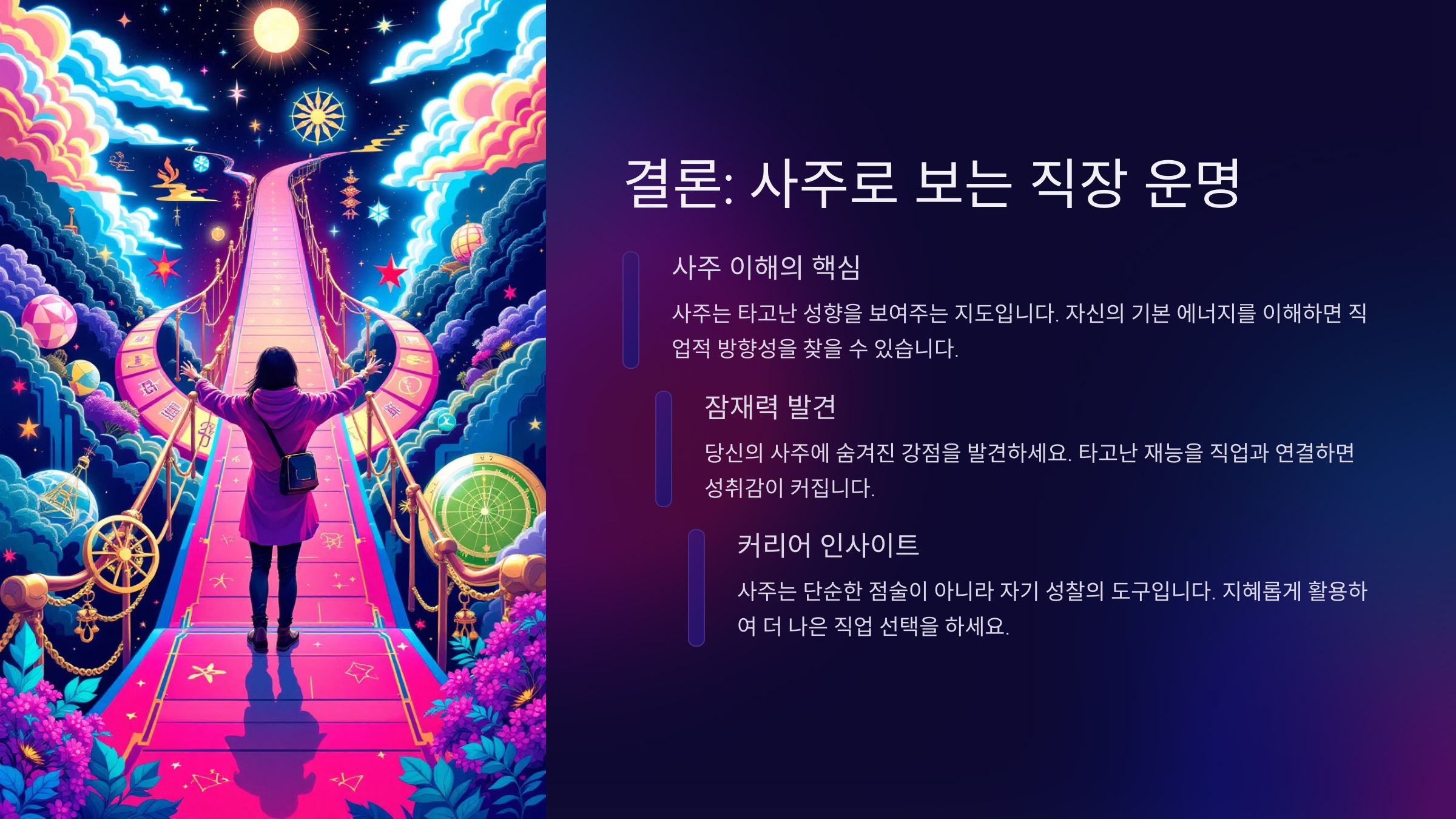 여기서 중요한 건, 좋은 직장운도 결국 ‘자신의 성향을 정확히 이해하고, 그에 맞는 구조 속에서 살아가는 것’이에요. 사주를 통해 자신을 이해하고, 그것을 삶에 잘 적용한다면 그게 진짜 ‘운이 좋은 인생’이 아닐까 싶어요 😊