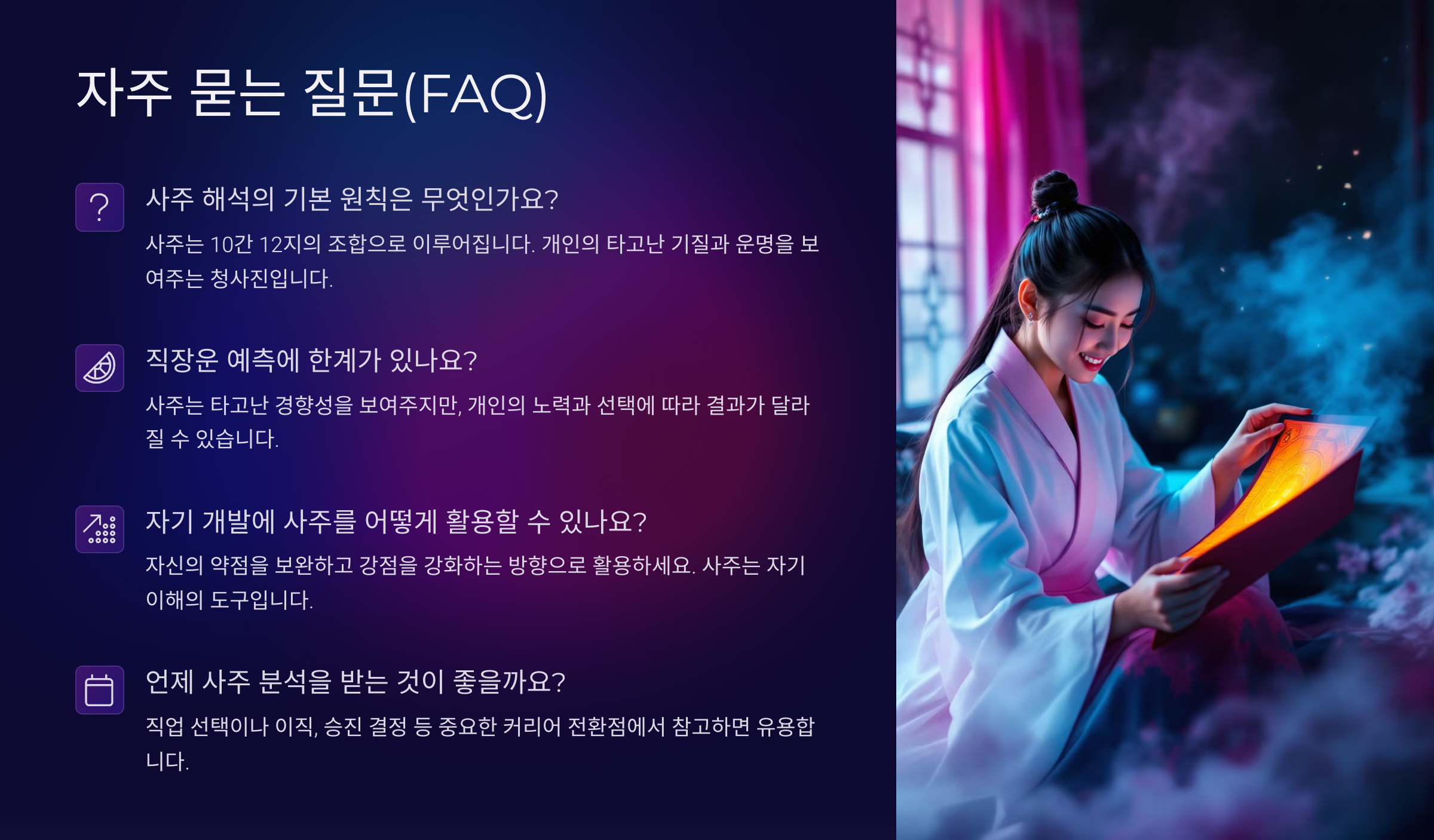 A7. 네, 사주는 성향과 기질을 알려줘요. 식상이 강하면 창의적인 일, 관성이 강하면 조직생활에 어울리고, 재성이 강하면 실적 중심 직무가 적합해요.
