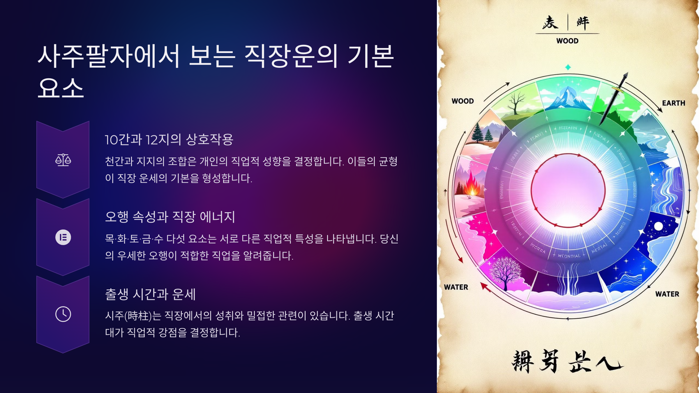직장생활이 잘 풀리는 사람들의 공통점은 ‘운이 좋다’보다, ‘사주 흐름이 조화롭다’는 점이랍니다. 그럼 이어서, 어떤 사주 요소들이 실제 직장운을 만들고 있는지 하나씩 살펴볼게요! ⏩