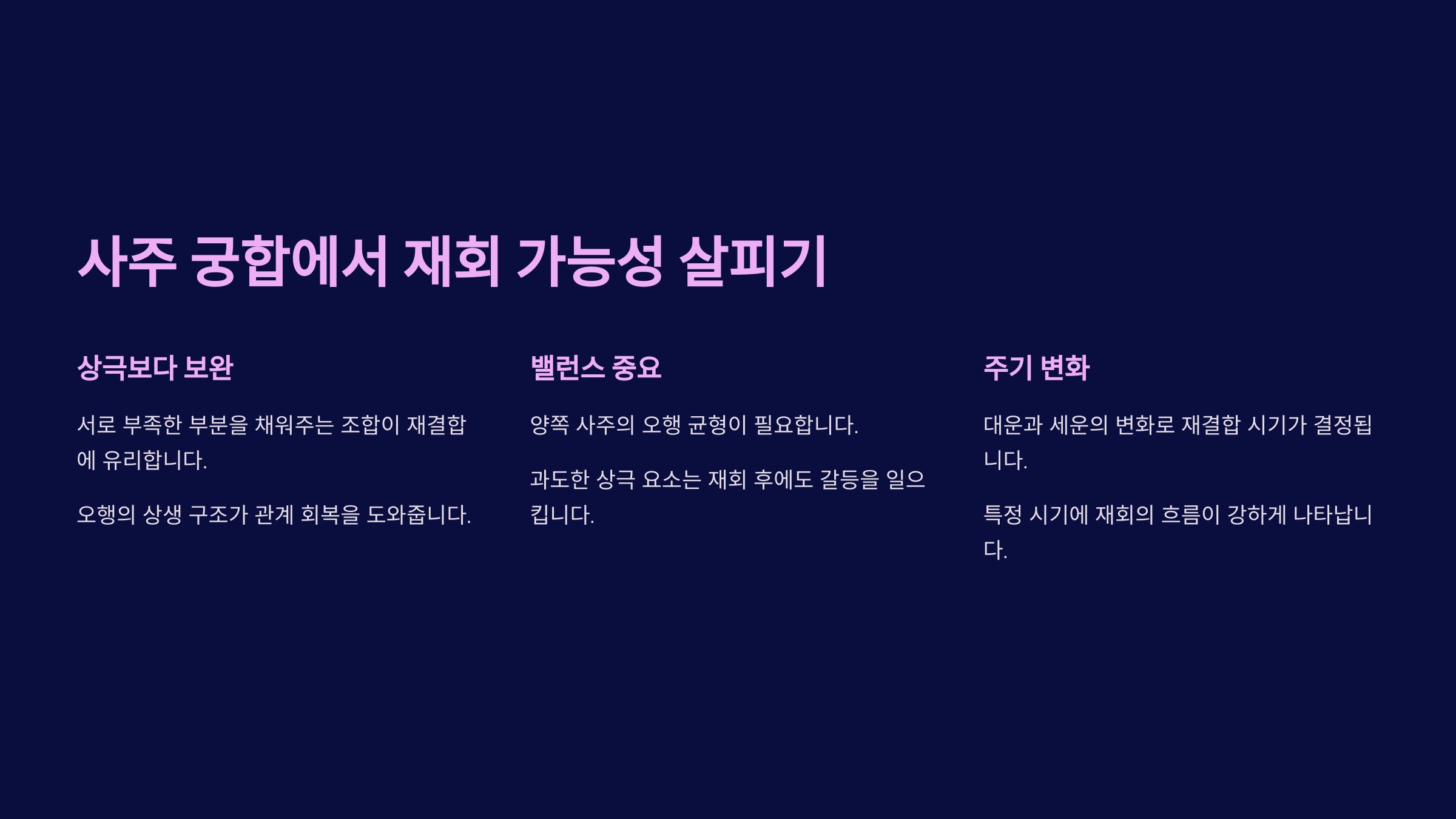재회 사유 비율(%) 설명 감정 정리 미완 38% 이별 후에도 마음이 남아 있었음 자녀 문제 26% 자녀 양육과 관련된 결속력 경제적 사정 17% 생활 기반 유지 목적 서로의 변화 감지 19% 상대가 변했다는 느낌 이처럼 다양한 이유로 사람들은 다시 연결돼요. 하지만 감정만 앞세운 재회는 오래가기 어렵다는 걸 기억해야 해요. 재회는 과거로 돌아가는 것이 아니라, 새로운 관계로 다시 시작하는 거예요. 그 시작점에서 사주는 어떤 방향을 보여줄 수 있을까요?