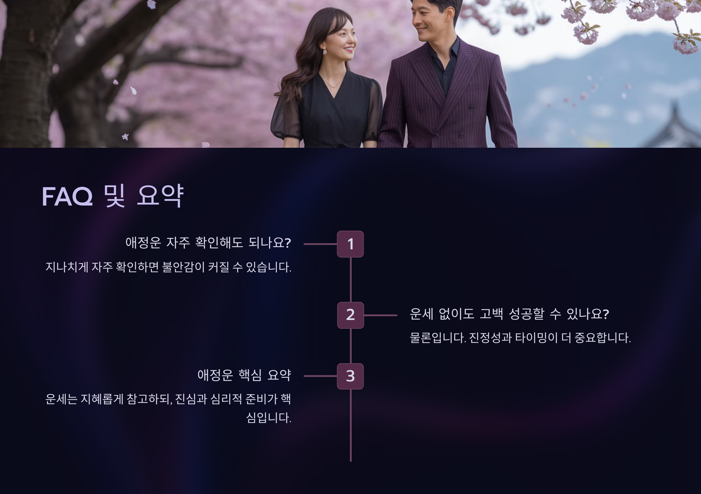 사례들을 보면 공통점이 보여요. 성공한 사람들은 대부분 애정운이 좋을 뿐 아니라, 상대의 상태를 세심히 고려하고 분위기를 조성하는 데 신경을 많이 썼어요. 반대로 실패한 고백은 대부분 급하게 감정만으로 밀어붙였을 때 일어났죠. 이 차이가 정말 중요하답니다.