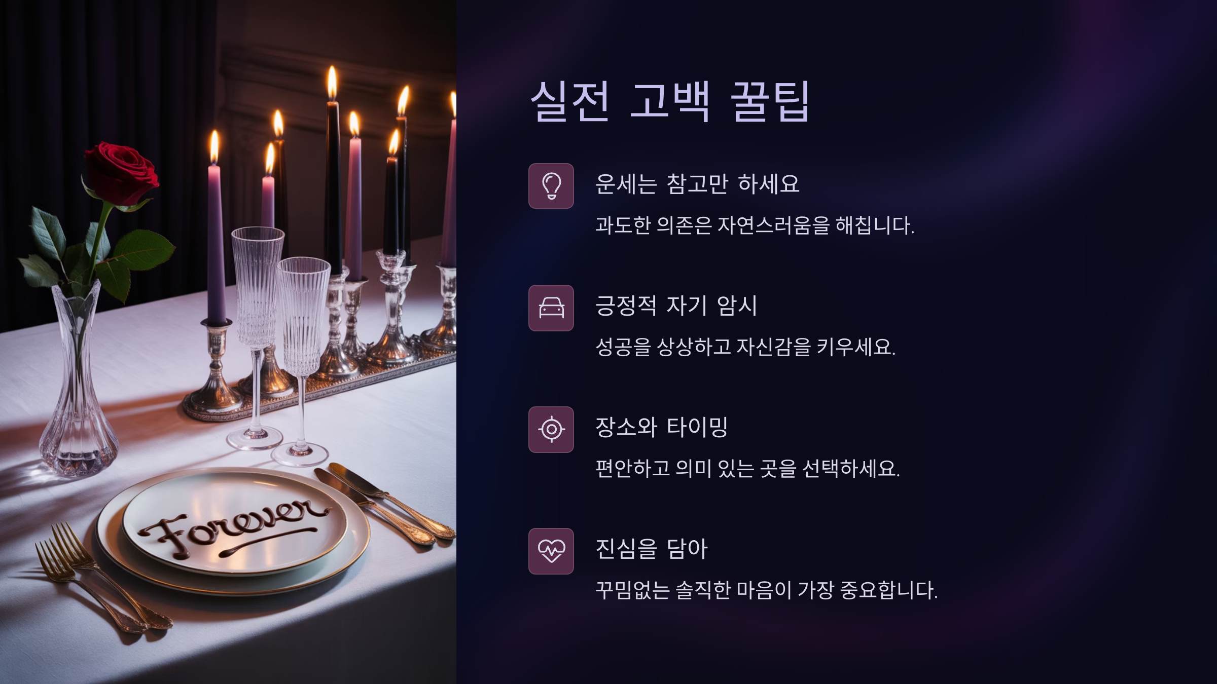 실전 고백 꿀팁 고백은 누가 더 멋진 말을 하느냐보다, 누가 더 진심을 담느냐에 따라 결과가 달라져요. 하지만 그 진심을 어떻게 포장하고 전달하느냐도 무척 중요하죠. 이 섹션에서는 애정운 좋은 날을 최대한 활용하면서, 실제로 고백에 성공할 확률을 높여주는 실전 꿀팁을 정리해볼게요.