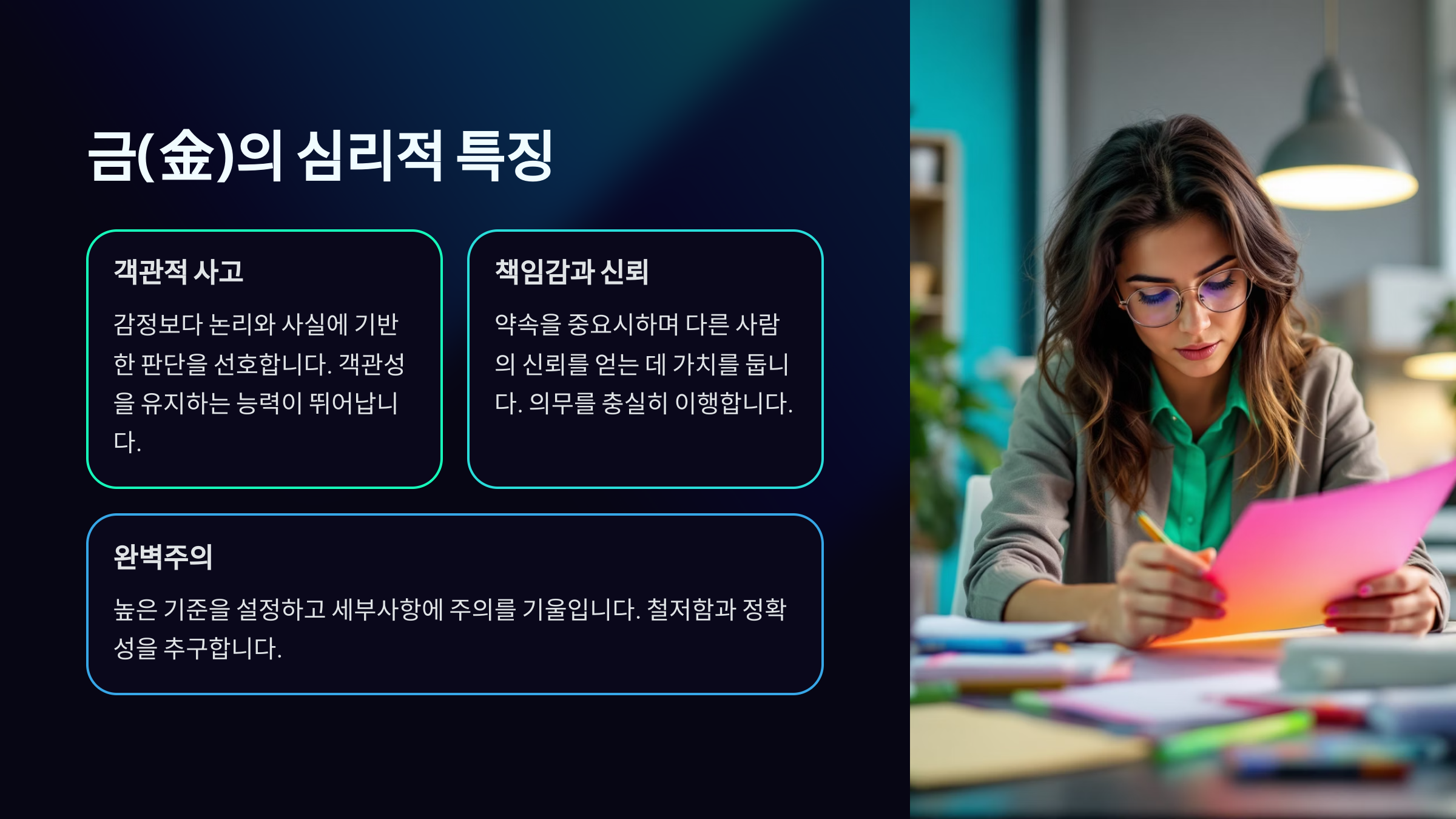 내가 생각했을 때 T 성향과 금(金)의 공통점은 이성 중심적이고 정리된 사고, 깔끔한 판단력에 있어요. 둘 다 감성보다 논리, 규율을 중시하며, 혼란보다 명료한 구조를 선호하죠. 그래서 이 둘을 함께 이해하면, 성향과 사주를 유기적으로 풀어낼 수 있답니다. 지금부터 그 심리적 교집합을 더 깊게 살펴볼게요! 😊