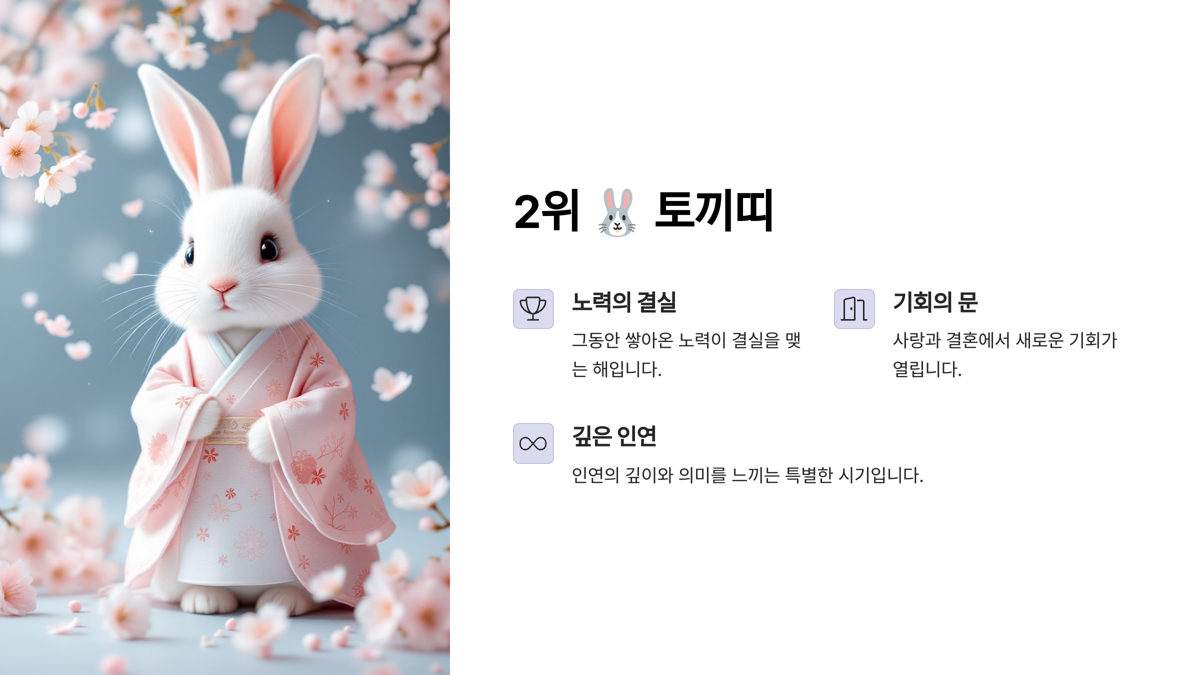 2025년 결혼운 2위는 바로 토끼띠예요! 토끼띠는 섬세하고 따뜻한 성향 덕분에 평소에도 사랑받는 띠지만, 2025년에는 유독 '천을귀인'이라는 좋은 기운이 들어오면서 결혼운이 크게 상승한답니다. 이 기운은 나에게 좋은 사람을 자연스럽게 붙여주는 힘을 가지고 있어서, 연애가 결혼으로 발전하기 딱 좋은 타이밍이에요.