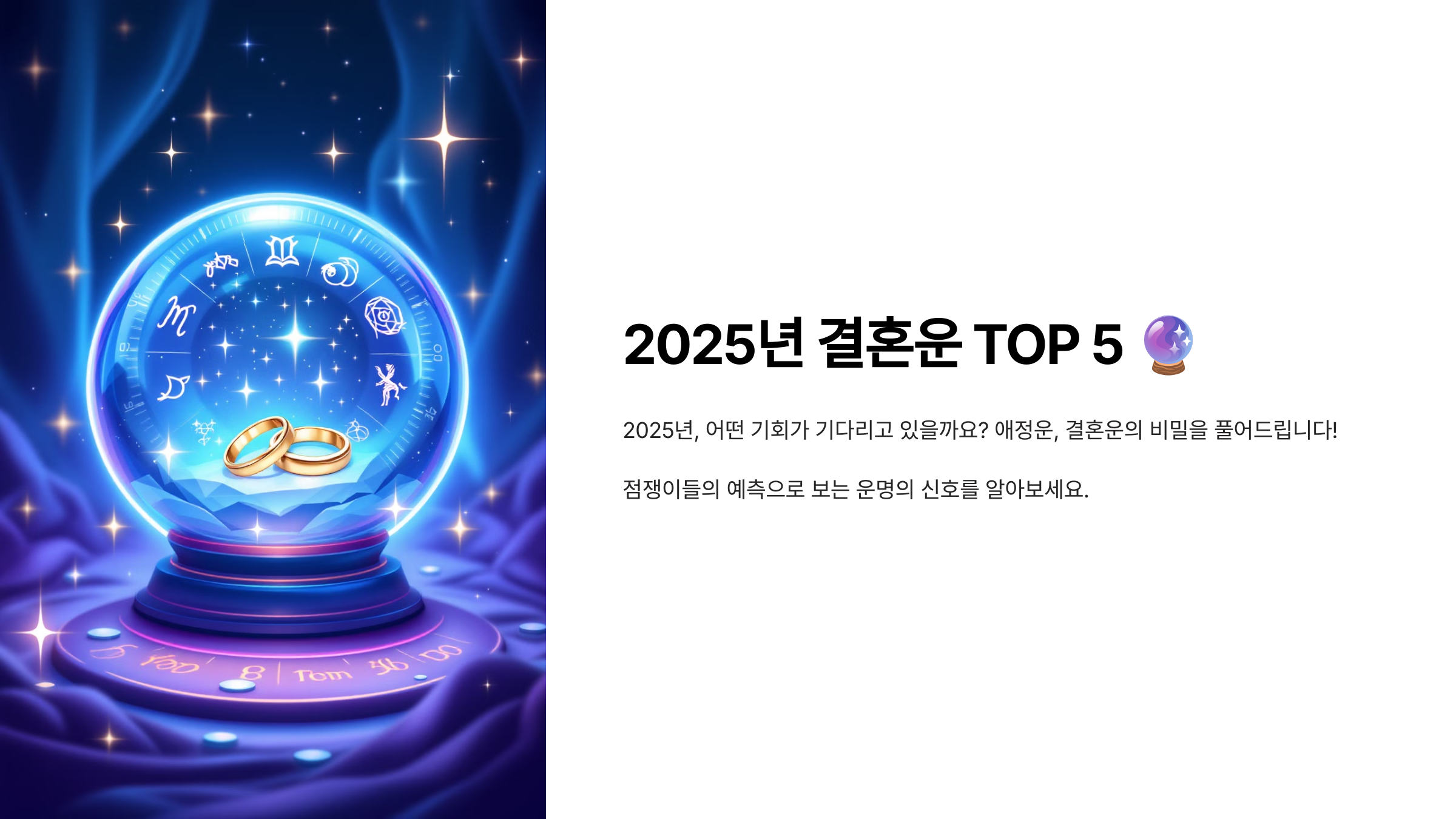 그럼 지금부터 2025년 결혼운이 가장 강한 띠 Best 5를 하나씩 살펴볼게요! 혹시 여러분 띠도 들어 있나 기대하면서 읽어주세요 😊
