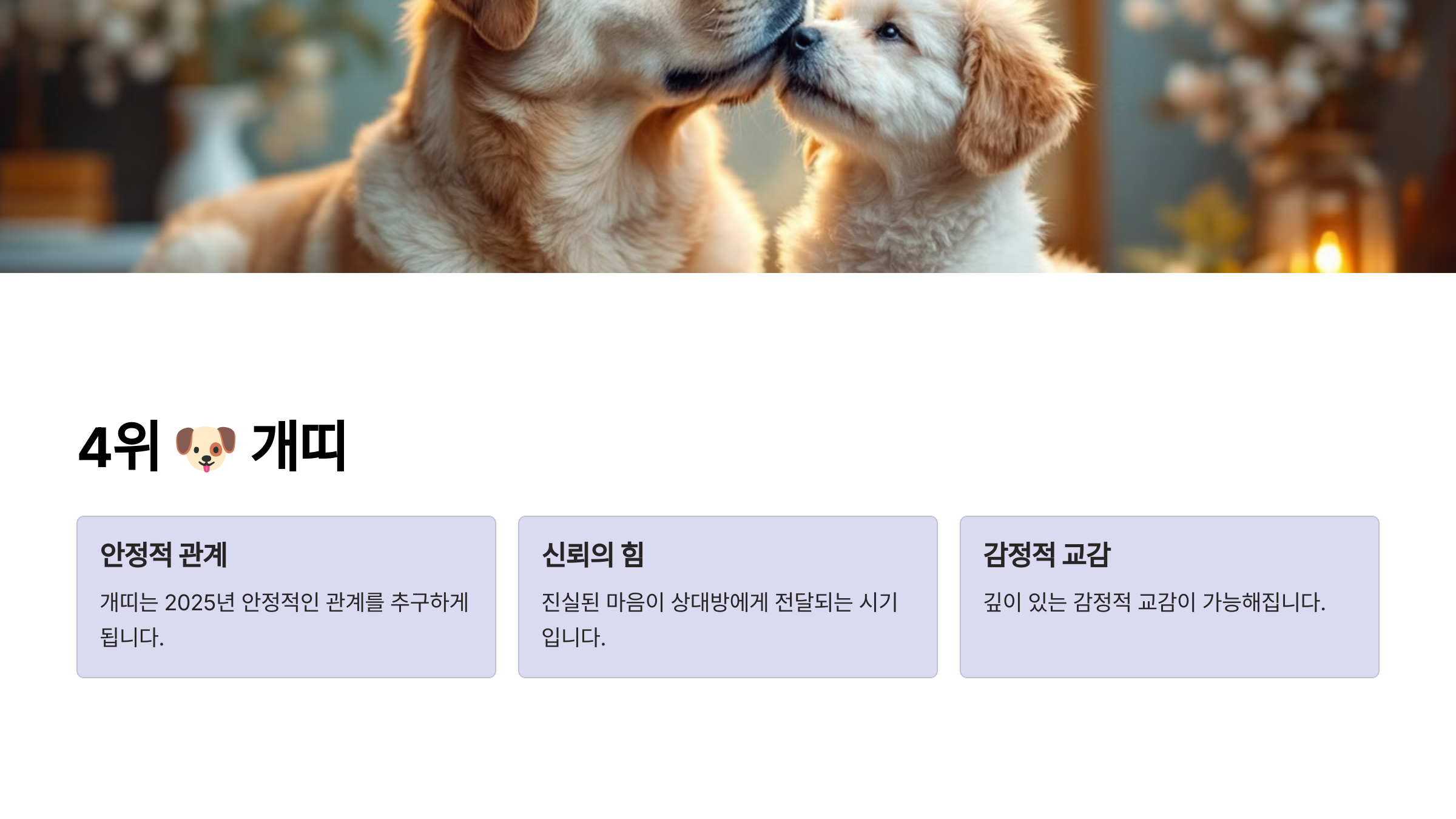 2025년 결혼운 4위는 믿음직하고 책임감 강한 개띠예요! 개띠는 원래 신중하고 한 사람에게 충실한 성격이 많아서 결혼운이 들어오면 금방 현실적인 계획으로 이어지는 경우가 많답니다. 올해는 특히 ‘합궁운’이 들어와서 연애가 깊어지고, 서로에 대한 확신이 생기는 해예요.