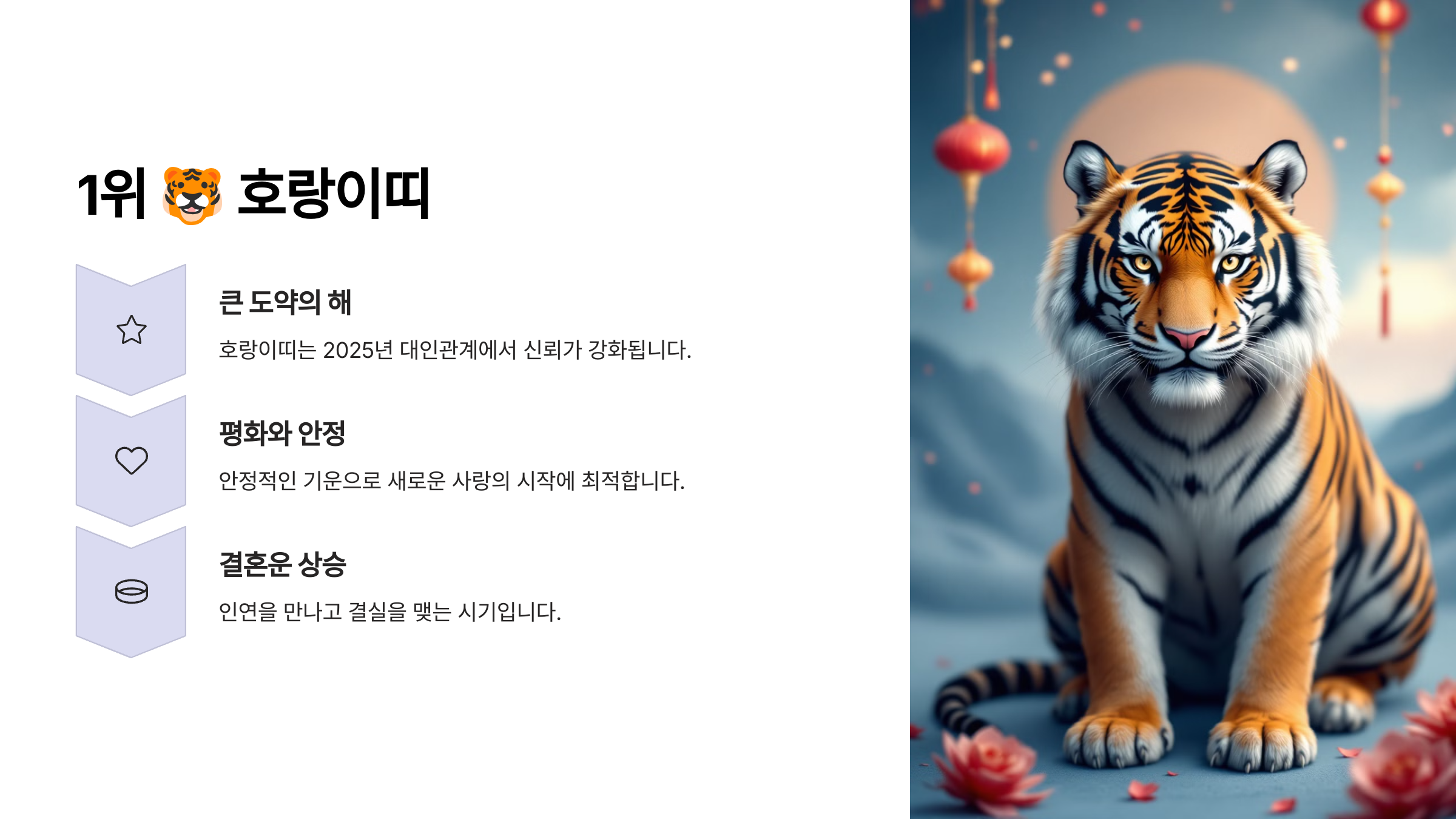2025년 결혼운 1위는 단연 호랑이띠예요! 호랑이띠는 2025년을 기점으로 강한 ‘배우자운’과 ‘연애운’이 겹쳐 들어오는 해를 맞이하게 되는데요, 이 시기에 새로운 인연이 생기거나, 오래 알고 지낸 사람과 급격히 가까워질 확률이 아주 높다고 해요.특히 올해는 사(巳)와 인(寅)이 ‘형살’로 부딪히는 기운이 있긴 하지만, 오히려 이 변화의 에너지가 연애에 활력을 불어넣는다고 하니 긍정적인 방향으로 작용한대요. 오래 연애한 커플이라면 "이제 결혼하자!"는 흐름이 생길 수 있고, 솔로라면 갑작스럽게 소개팅이나 우연한 만남으로 마음이 움직일 수 있는 해랍니다 💘