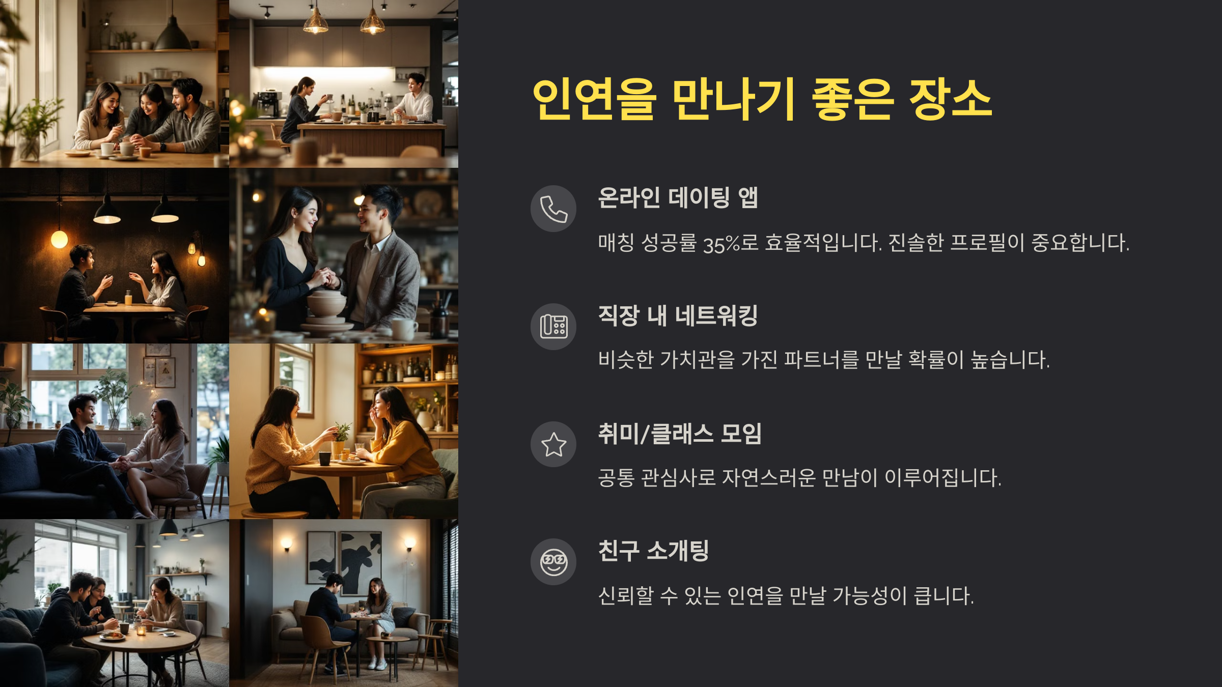 ☕ 카페나 북카페, 라운지처럼 사람들이 자유롭게 시간을 보내는 공간도 놓치지 말아야 해요. 특히 평소에 혼자 있길 좋아하는 사람이라면 이런 장소에서 인연을 만나는 경우가 많아요. 같은 공간에서 우연히 시선이 마주치거나, 책 한 권을 매개로 대화가 시작될 수도 있으니까요.