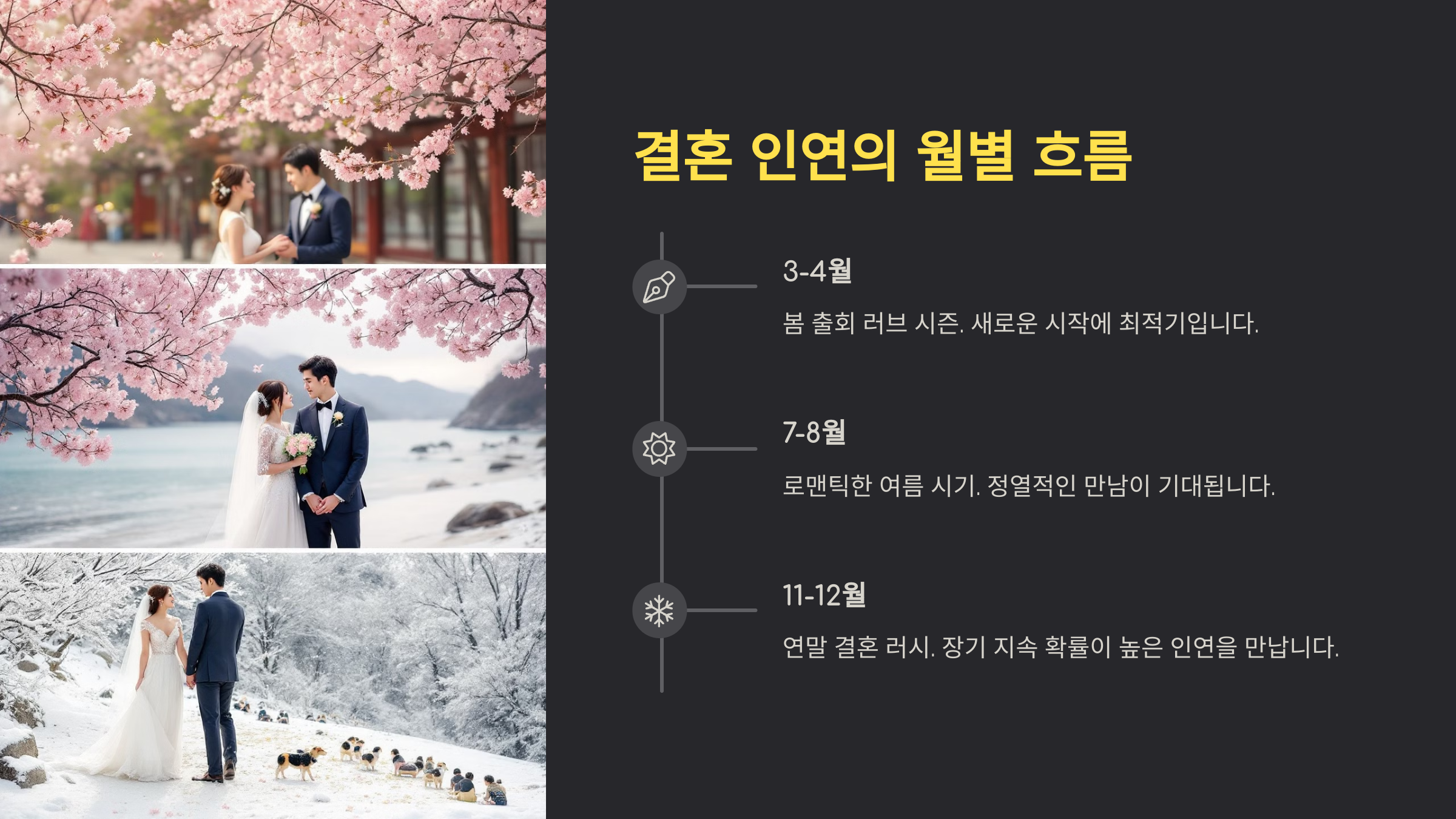 특히 사주에서 목(木)과 화(火)의 기운이 잘 조화되는 사람이라면 2025년은 결혼에 있어서 최고의 타이밍일 수 있어요. 반면 이 기운이 충돌하거나 상극이 되는 사람은 조심스럽게 접근해야 하는 시기이기도 해요. 자, 그럼 지금부터 띠별, 월별, 장소, 운세별로 결혼운을 분석해볼게요! 🎉