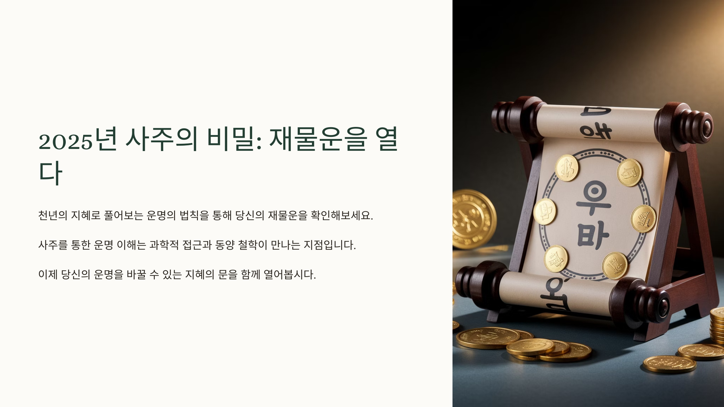 2025년은 을사년(乙巳年)으로, 목(火)과 금(金)의 기운이 강하게 작용하는 해라고 해요. 이런 해에는 특정 사주를 가진 사람들에게 뜻밖의 재물운이 쏟아질 수 있다고 해요. 특히 재성을 중심으로 한 구조가 강한 사람들, 또는 재물운이 대운이나 세운에서 흐르는 시기를 맞이한 이들에게는 인생 역전의 해가 될 수도 있는 해랍니다.