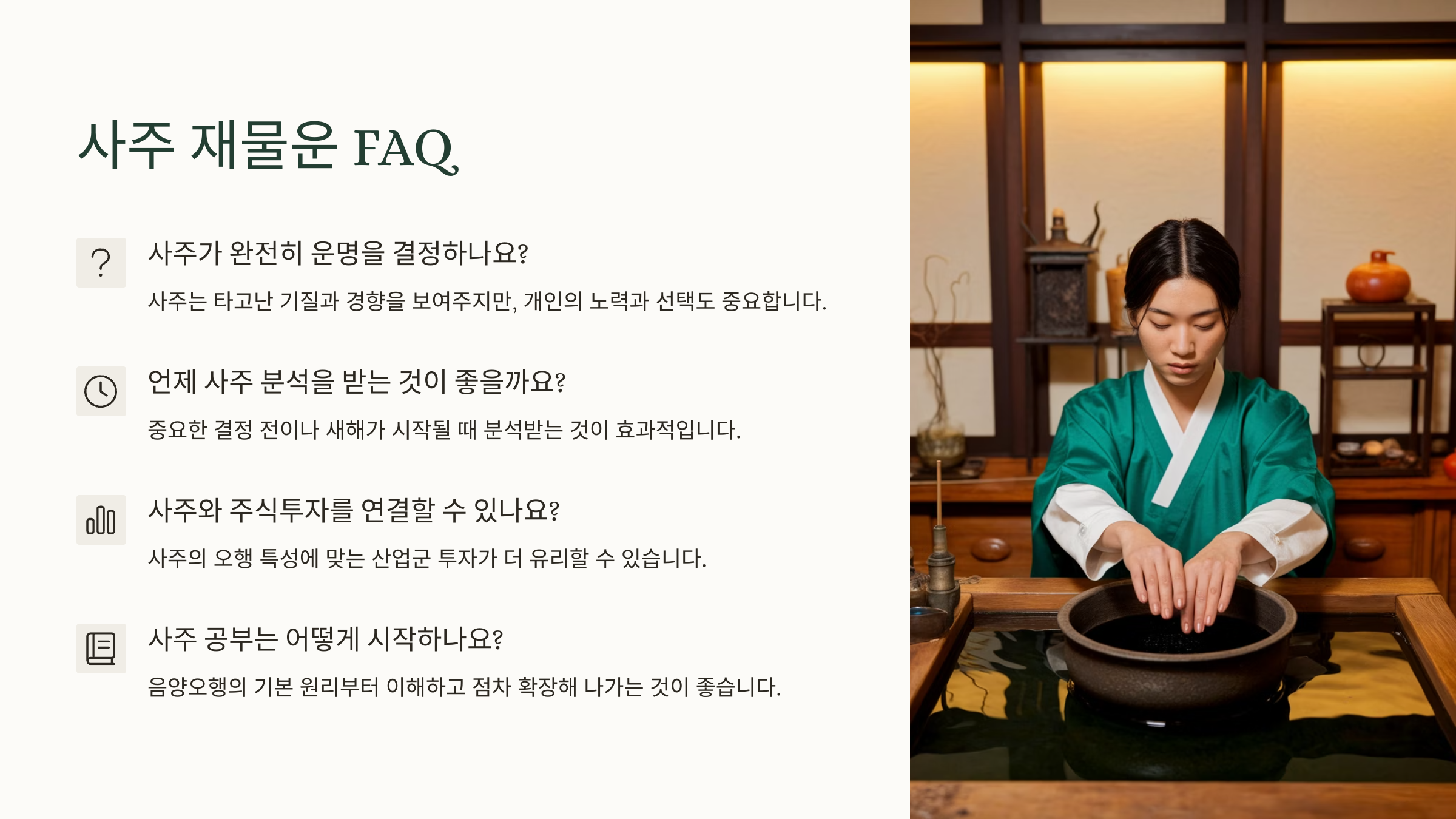 이런 실사례들을 보면, 사주가 단순한 운세를 넘어 나만의 전략과 실행 플랜을 만들 수 있게 해준다는 걸 알 수 있어요. 그래서 ‘운빨’보다는 '운 활용력'이 중요하다는 말도 있답니다.