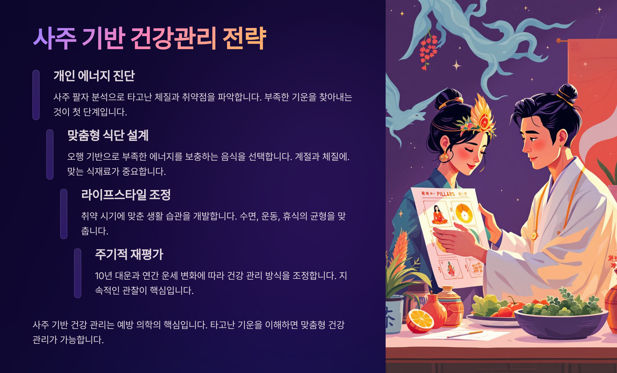 사주에서 건강운을 본다고 해서 단순히 예언만 하는 건 아니에요. 내 사주가 어떤 체질을 가졌는지, 어떤 계절에 약한지 알면 훨씬 효율적인 건강 관리를 할 수 있어요. 마치 맞춤형 건강 솔루션처럼 말이죠!