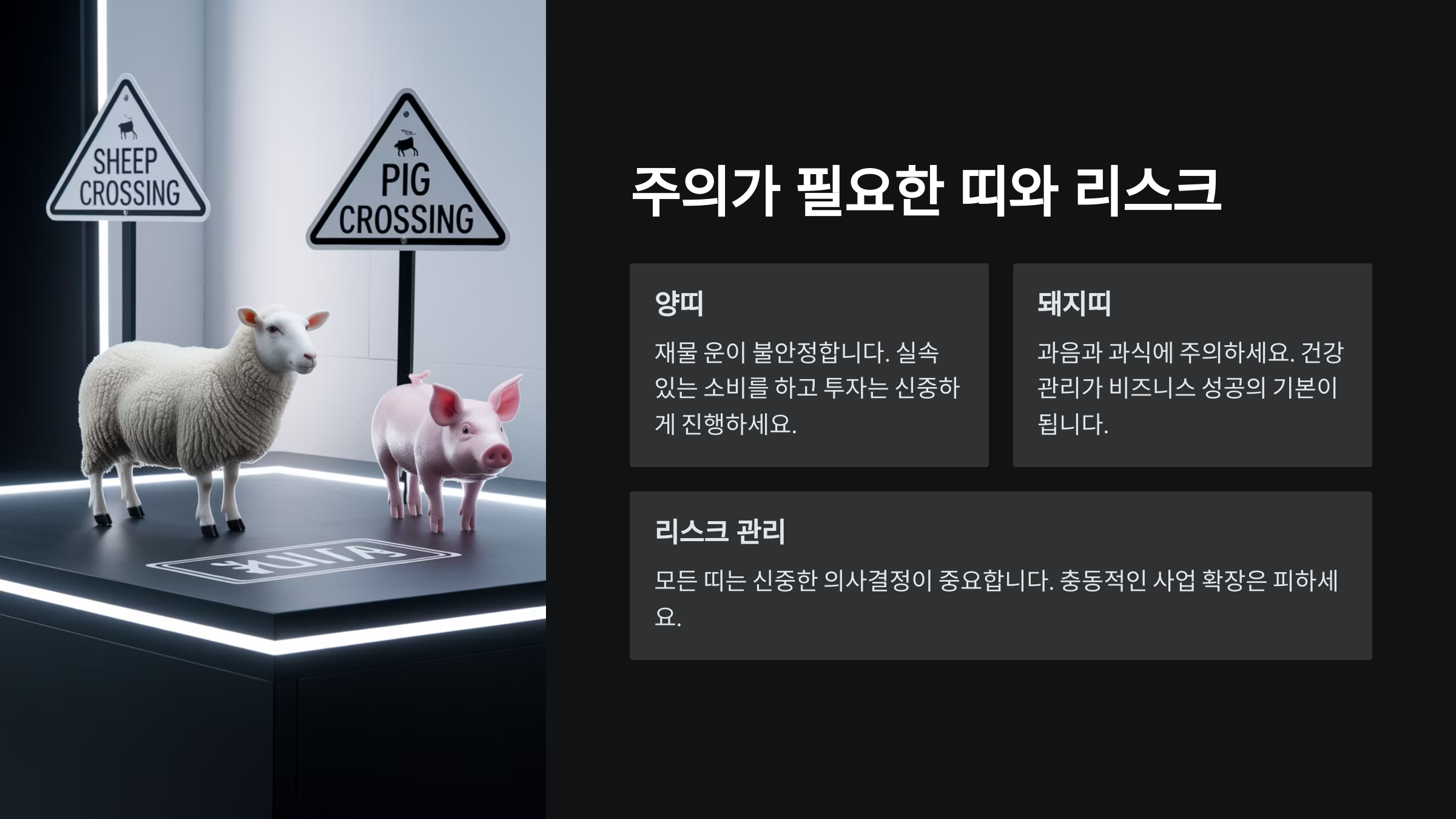 사주와 달리 띠는 대중적인 흐름을 보여주는 것이니, 위에 해당하는 띠라고 해도 반드시 조심해야 한다는 건 아니에요. 다만 일반적인 운 흐름상 '급한 시작보단 준비된 실행'이 더 좋은 결과를 만든다는 점을 기억해요!