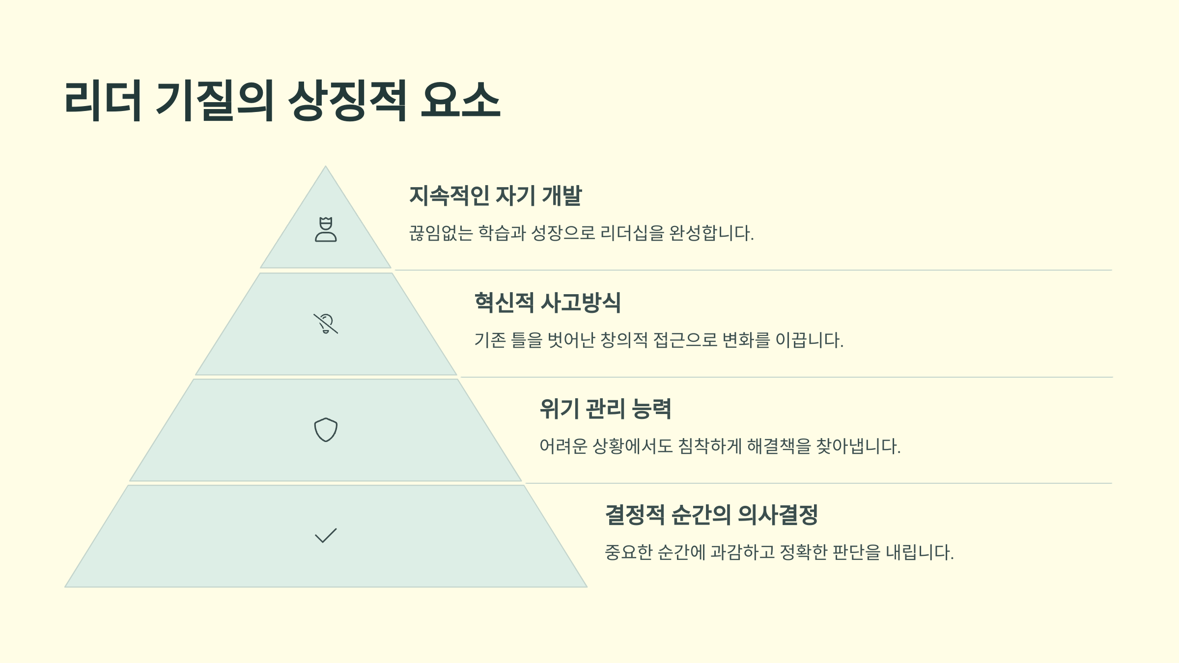 전략 설명 경청 의견을 수용하는 열린 자세 감정공감 사람의 마음을 읽는 능력 위임 신뢰하고 맡기는 리더십 에너지 관리 휴식과 집중의 균형 멘토링 경험에서 배우는 리더 🔮 리더 기질을 상징하는 요소